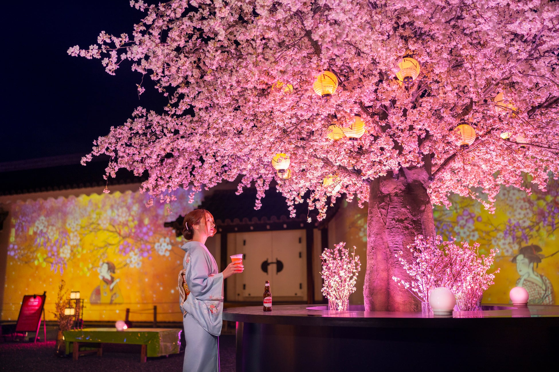 二条城屈指の桜スポットで、お酒やお茶のお食事や、殺陣パフォーマンスショーを心ゆくまで楽しめる「プレミアムお花見エリアセットチケット」が好評発売中。各ブースには、『サクラヒラリ』とネイキッドがコラボレーションした空間演出を施し、淡いピンクの美しい花を咲かせる「啓翁桜」が華やかな春を演出します。