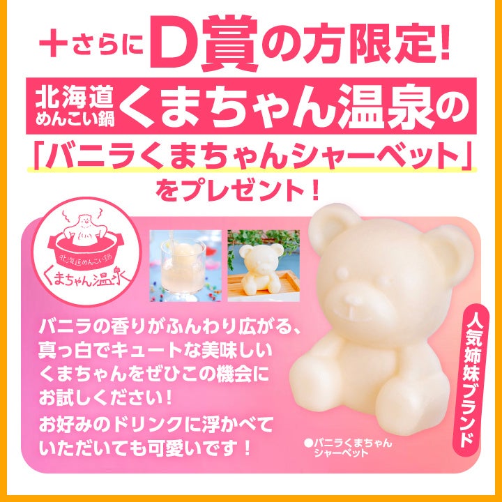 大阪王将の人気冷凍惣菜に加え、A賞には「A5等級国産黒毛和牛」「うなぎ」「冷凍うに」などの豪華食材をラインアップ。また、A賞・C賞には通常販売に先行して大容量の新商品『ぷるもち水餃子』『肉焼売』を投入しました。C賞にはその他にも『羽根つき餃子50個』や『羽根つきスタミナ肉餃子30個』など大容量商品が満載です。ぜひ冷凍庫を空けた状態でチャレンジしてください。さらに末賞に当たるD賞には今回特別に「北海道めんこい鍋くまちゃん温泉」の、かわいすぎる『バニラくまちゃんシャーベット』をプレゼントいたします。A~D賞すべてに魅力的な商品が詰まっており、どのセットが届いても"うれしい驚き"を感じていただける内容です。