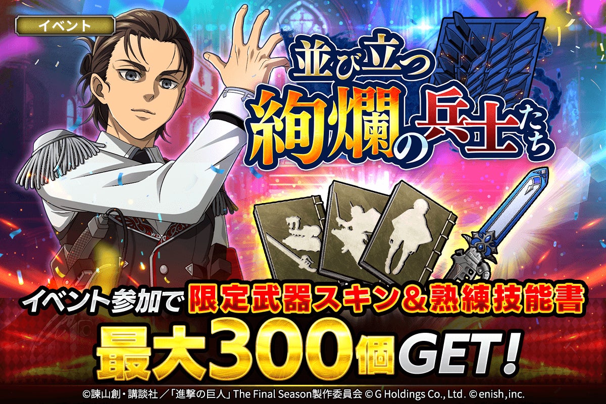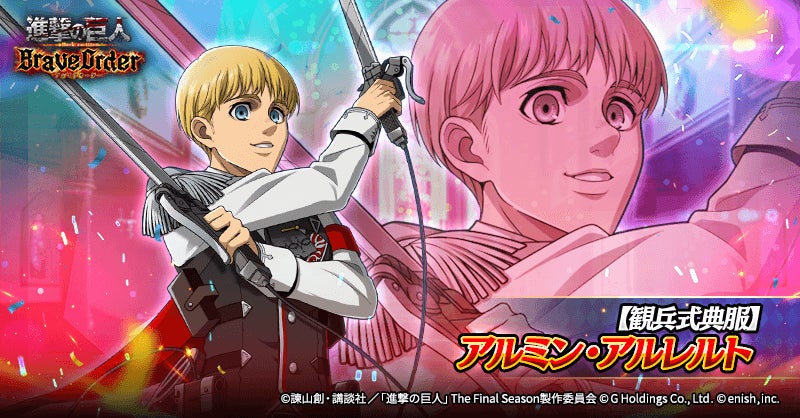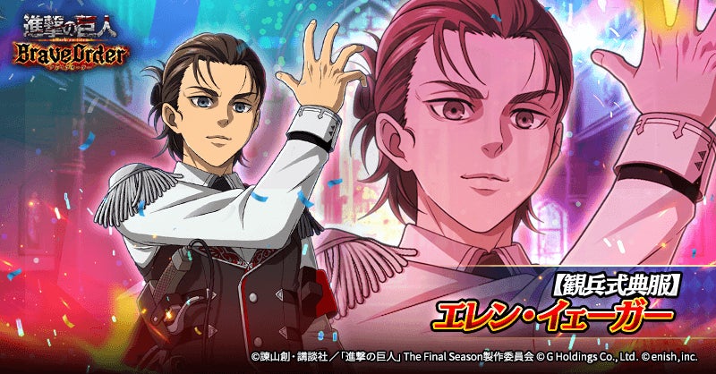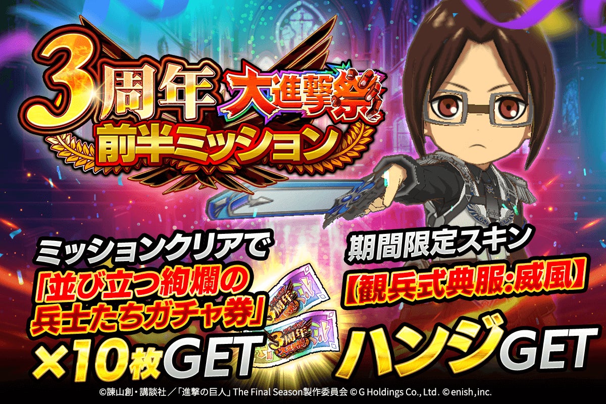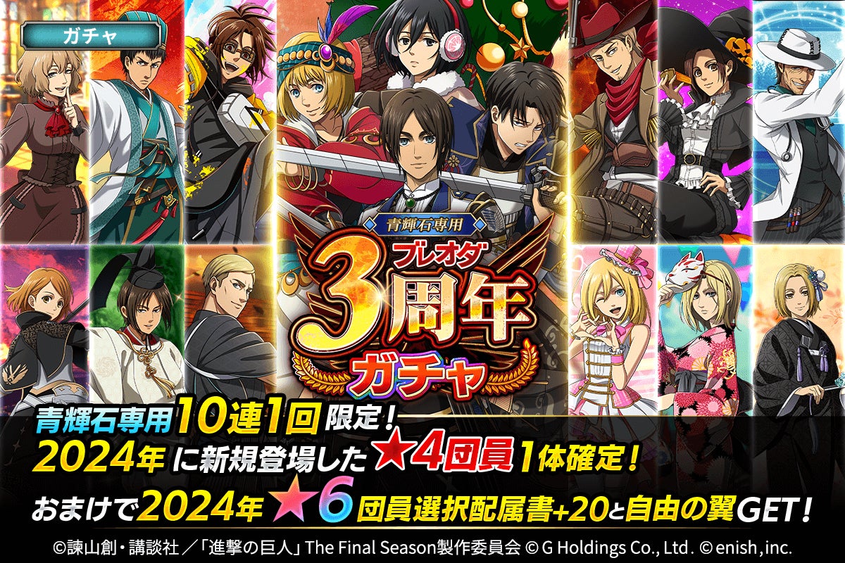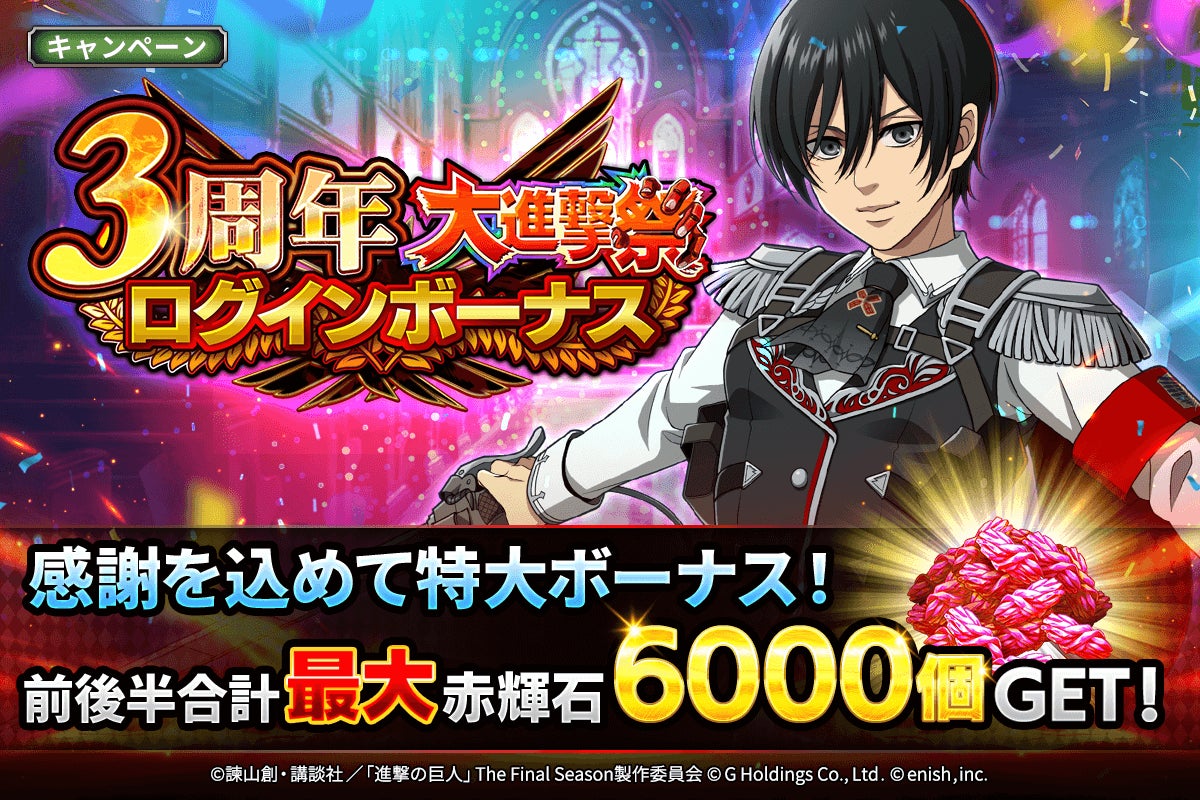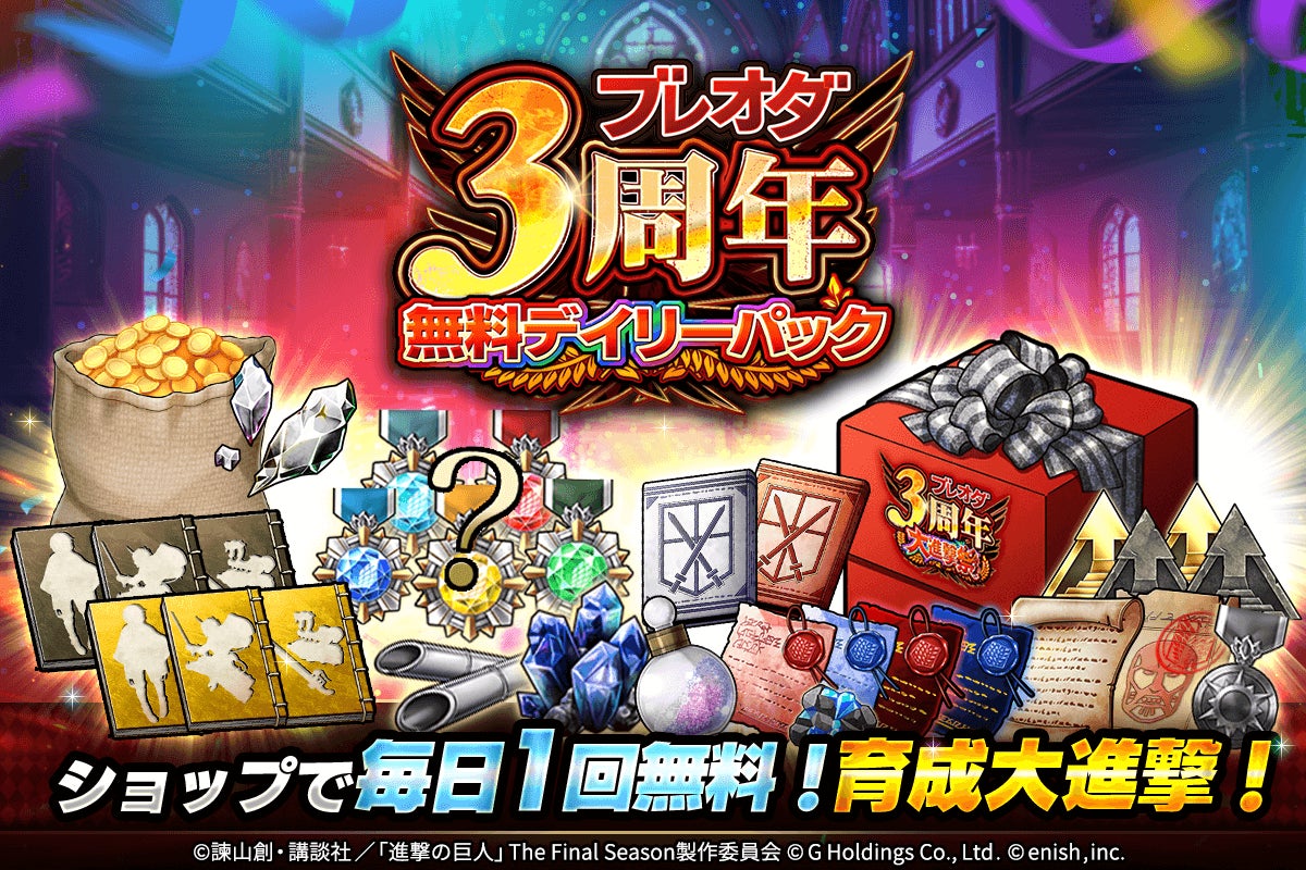 株式会社enish(本社:東京都港区、代表取締役社長:安徳 孝平、以下enish)は、アニメ『進撃の巨人』のスマートフォンゲーム最新作「進撃の巨人Brave Order」にて、2025年2月10日(月)より、ブレオダ3周年大進撃祭を開催!今ならガチャなどに使用できる赤輝石が最大6,000個もらえちゃう!またブレオダ3周年大進撃祭前半ミッションではハンジの特別な衣装、並び立つ絢爛の兵士たちイベントでは育成素材の熟練技能書が最大300個がGET可能!その他、最新情報はゲーム公式サイト・ゲーム公式X(旧Twitter)アカウントにて随時公開して行きますので、ぜひご覧ください。