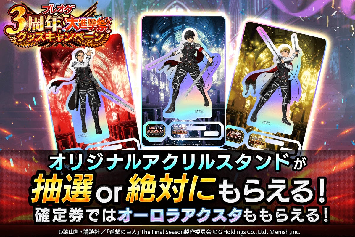 2025年2月10日(月)より、並び立つ絢爛の兵士たちで登場するエレン、ミカサ、アルミンをモチーフにした限定アクリルスタンドが抽選又は絶対にもらえちゃうグッズキャンペーンを開催!限定アクリルスタンドがもらえるこのチャンスを見逃すな!