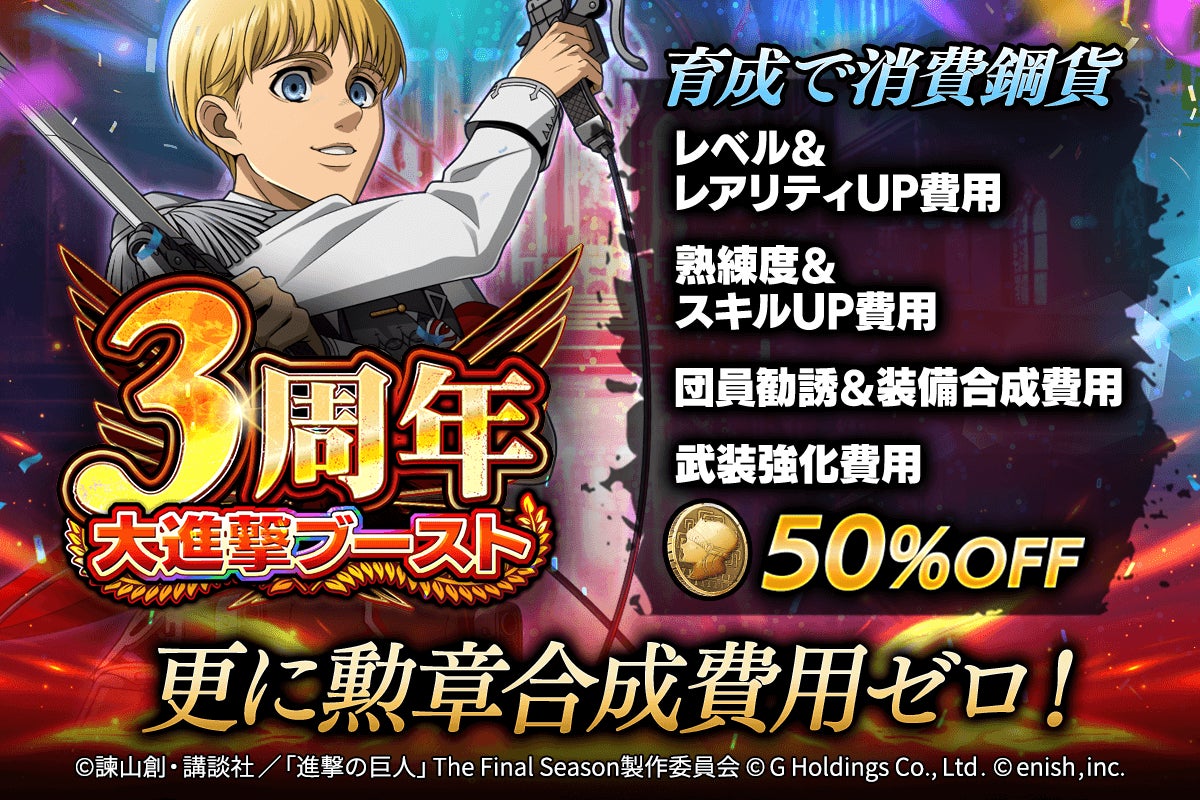 2025年2月10日(月)より、団員のLvアップやレアリティーアップなどの育成費用が半額になる3周年大進撃ブーストを開催!この機会に団員を強化し強敵に挑もう!