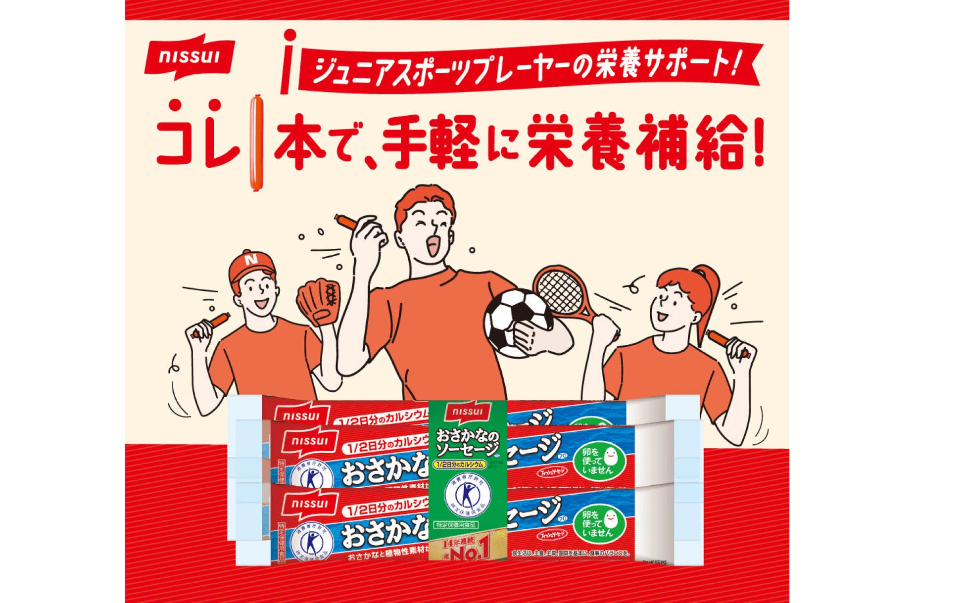 ニッスイでは1952年からフィッシュソーセージの製造・販売を始めて70年以上も多くの方々に愛され続ける商品となっています。1本で1日に必要なカルシウムの約半分が摂取でき、手軽に、体をつくるサポートを続けてまいりました。2023年よりニッスイが力をいれている「夢を叶える部活生にサンプリング」企画。食育の大切さが求められるこの時代に、より育成年代のスポーツをしている子供たちを支援したいと継続的にサンプリング企画を実施しております。