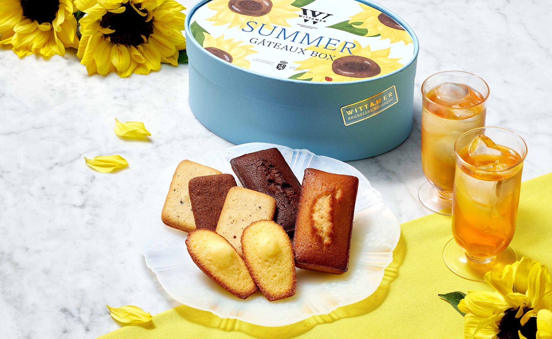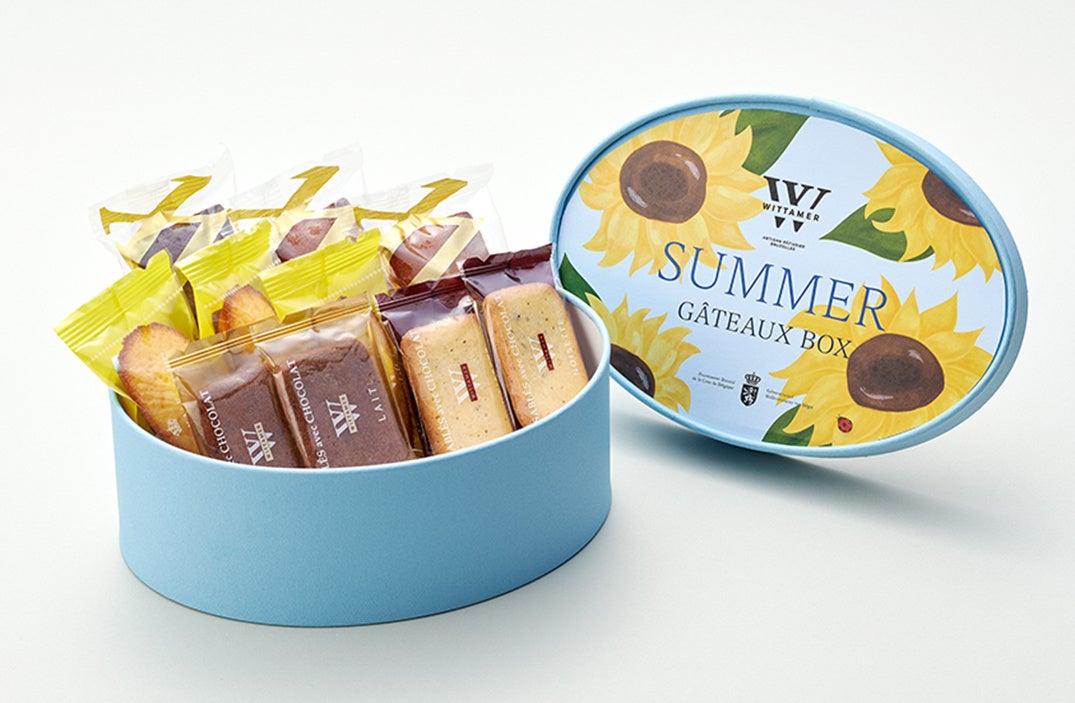 レモン風味が爽やかな春夏限定のロイヤル・マドレーヌをはじめ、サクサクに焼き上げたサブレにチョコレートをサンドしたサブレ・ショコラ、バターの風味豊かな生地にアーモンドやチョコレートの香りが広がるフィナンシェなど、人気の洋菓子を詰め合わせました。爽やかな水色に黄色のひまわりが映える夏らしいパッケージです。
