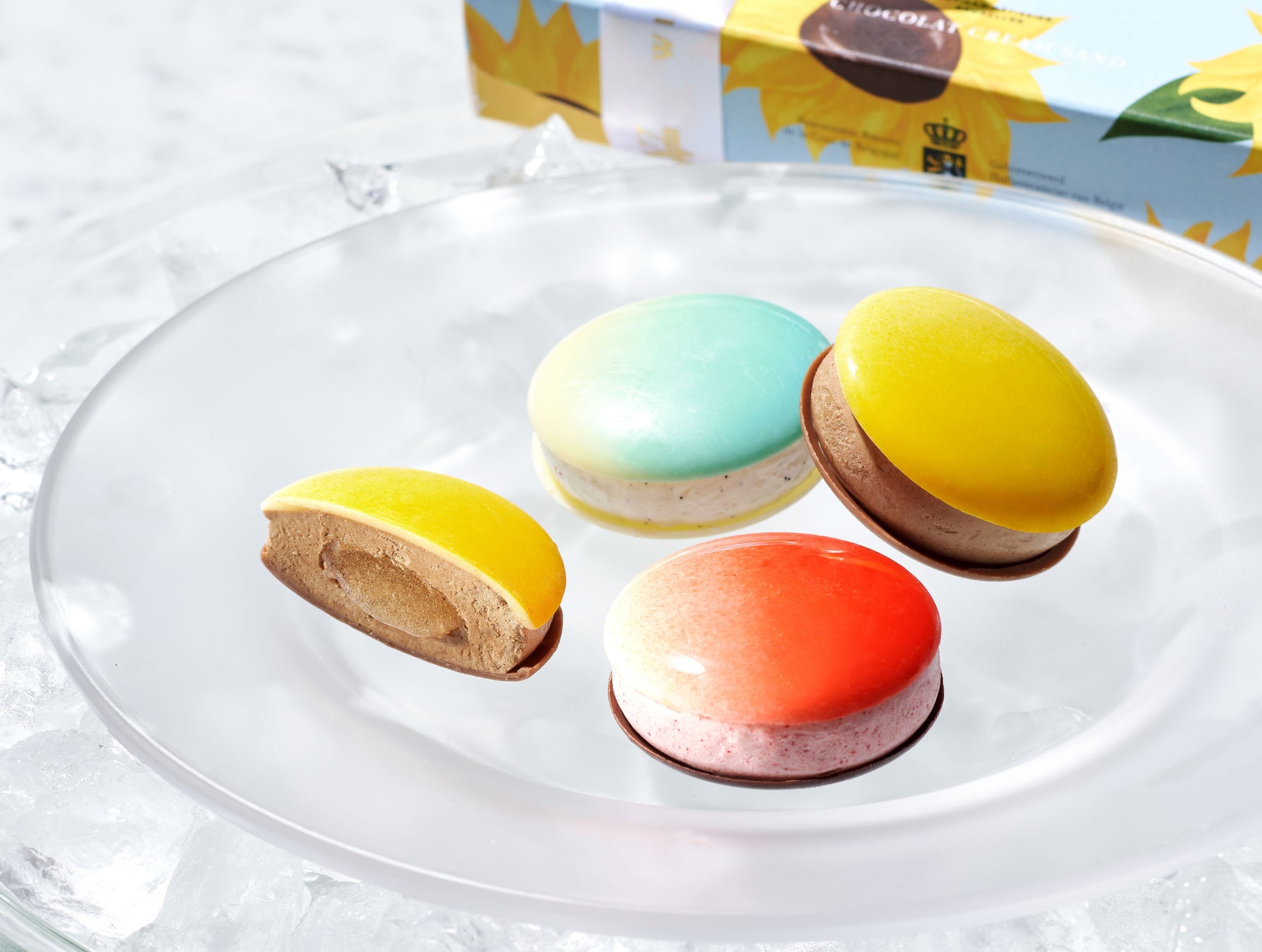 空気を含ませたチョコレートクリームは、ふわっと軽くなめらかな口どけ。甘酸っぱいコンフィチュールや香ばしいプラリネと一緒に色鮮やかなチョコレートでサンドしました。プラリネショコラとは違う、チョコレートとクリームの新しい組み合わせをお楽しみください。