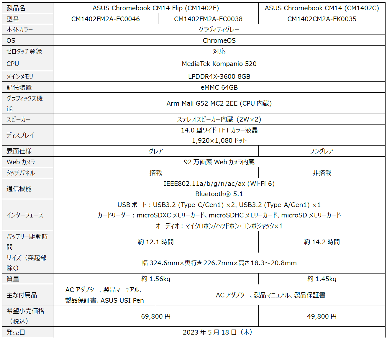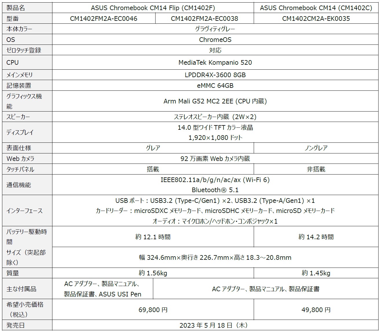 ASUS JAPAN株式会社は、スタイラスペンに対応した14型タッチディスプレイを搭載したフリップタイプのChromebookの「ASUS Chromebook CM14 Flip (CM1402F)」、フラットヒンジ採用で180°開く14型ディスプレイ搭載の「ASUS Chromebook CM14 (CM1402C)」、そして同じくフラットヒンジを採用しており、コンパクトさと拡張性を兼ね備えた11.6型のASUS Chromebook CX1 (CX1102)を発表しました。日常使いから学習や仕事まで、幅広い用途にご使用いただけるASUS Chromebook計3製品5モデルは2023年5月18日(木)より発売予定です。