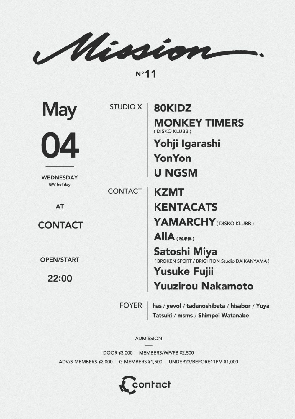 現Contactでは最後の開催となる今回は、アルバム「KLUBB LONELY」をリリースしたばかりのMONKEY TIMERS、プロデューサー・DJとして多方面から支持を高めているYohji Igarashi、DJ/シンガーソングライターとして活動するYonYonがStudio Xフロアに、SOUND MUSEUM VISIONで行われている人気パーティEDGE HOUSEのレジデントを務めるKZMTとKENTACATS等がContactフロアに出演。