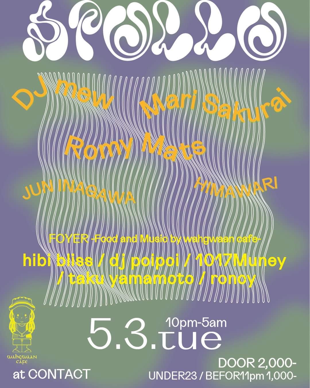 GW只中の早すぎる熱帯夜。バーエリアにはDJ mewやMari Sakuraiなど踊らせることに依存したプロが集合。Foyerではフィジカな名手がスピーカーをワイニーさせてバウンスさせる。火山のようなイマジネーションと温暖なフロアに太陽神アポロが微笑む。