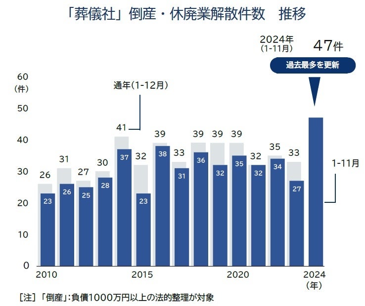 「葬儀社」の淘汰が加速している。2024年11月までに発生した葬儀社の倒産(負債1000万円以上、法的整理)が12件、休廃業・解散(廃業)が35件発生し、計47件が市場から退出した。23年から1.7倍ペースで増加しているほか、これまで最多だった2007年(42件)を超え年間最多を更新するなど、増加傾向が目立っている。