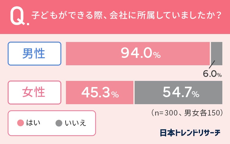 男性の94%が「子どもができる際、会社に所属していた」と回答したのに対し、女性は45.3%と半数を下回る結果となりました。