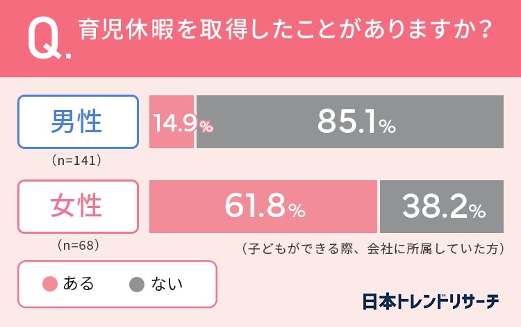 女性の61.8%が「育児休暇を取得したことがある」と回答している一方で、男性は14.9%という結果となりました。