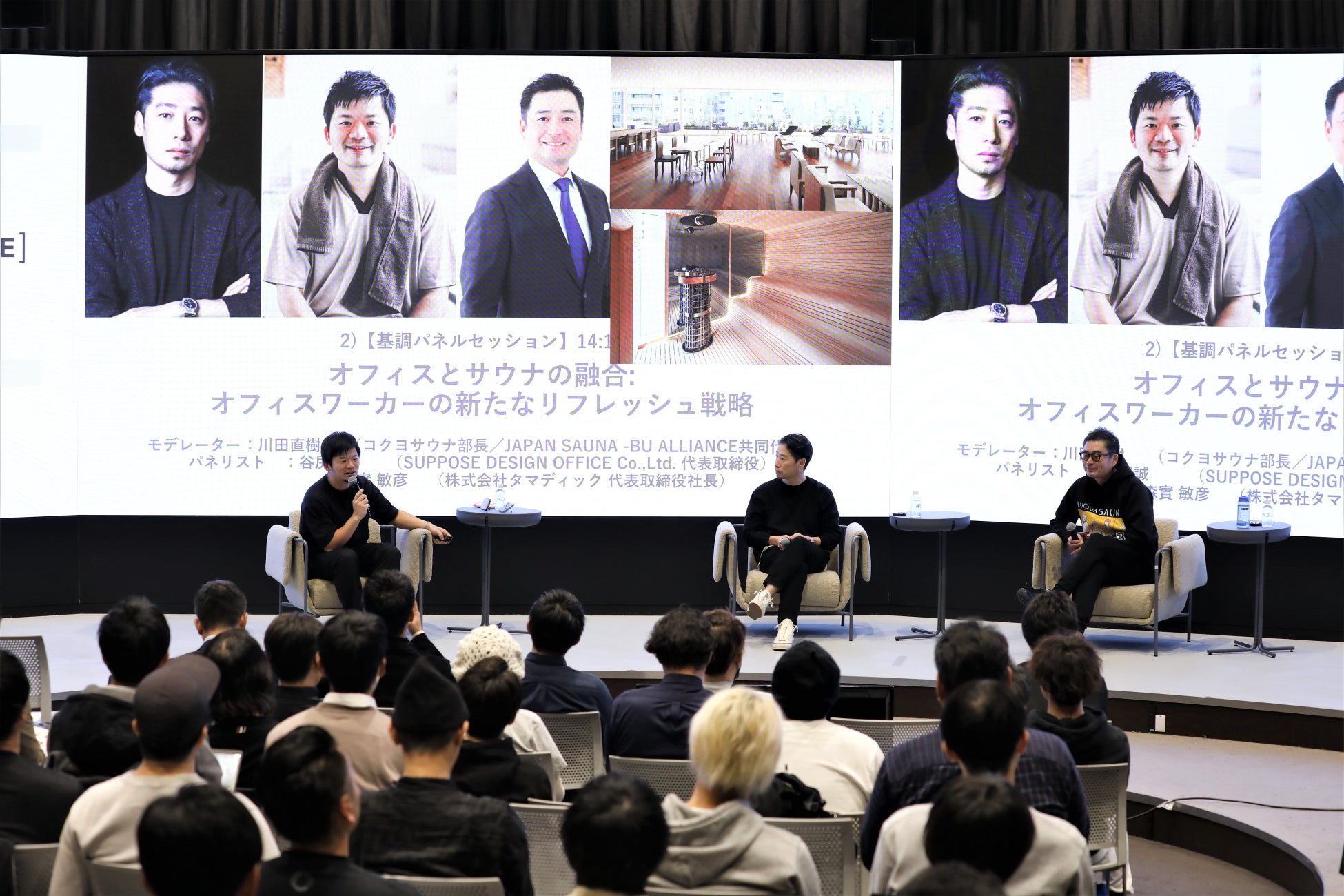 「オフィスとサウナの融合」のセッションでは、パネリストとして株式会社タマディック代表取締役社長の森實 敏彦様、SUPPOSE DESIGN OFFICE Co.,Ltd. 代表取締役の谷尻 誠様が登壇。そしてモデレーターとして、コクヨサウナ部部長であり、JAPAN SAUNA -BU ALLIANCE共同代表の川田 直樹が登壇しました。川田はコクヨ社員でありながら、「カワちゃん」の名前でサウナに関するさまざまなメディアに出演。サウナプロデュースなど自身の活動を交えながら、進行を務めました。