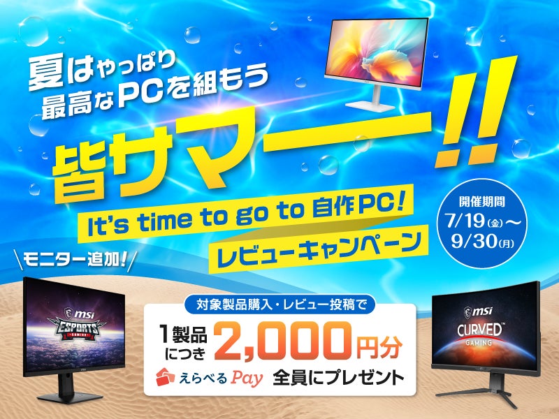 対象のMSIモニターのレビューで2,000円分のえらべるPayが貰える『皆サマー!! It’s time to go to 自作PC! レビューキャンペーン』対象製品にMSI液晶モニターが追加!