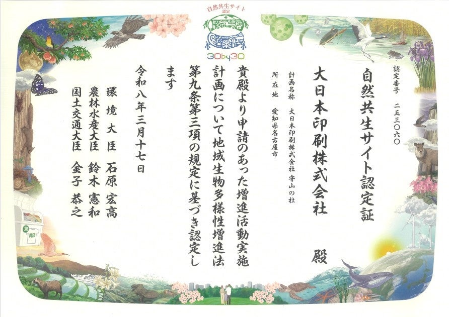 大日本印刷株式会社(DNP)は、名古屋事業所(愛知県名古屋市守山区)の敷地内に創出した緑地「守山の杜」で、地域在来の植生の維持・再生に向けた取り組みを2012年から進めています。このたび同緑地が、環境省などが認定する「自然共生サイト」の「創出タイプ」に認定されました。
