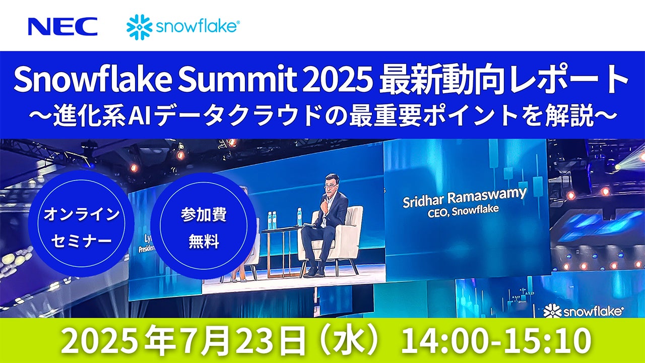 NECは、2025年7月23日(水)にSnowflake Summit 2025 に参加したNECメンバーが現地で得た知見を交えながら事例・最新技術・製品アップデート等について紹介する無料セミナーを開催します。