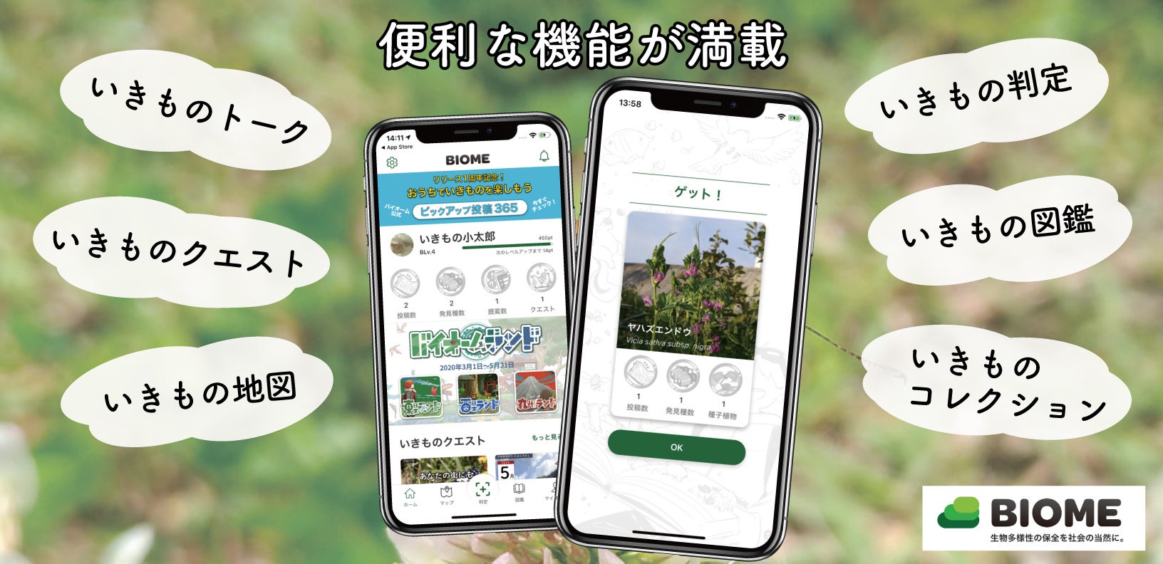 スマートフォンアプリ「Biome」は名前判別AI機能を使って動植物の判別ができるサービスで、日本国内のほぼ全種(約9万5千種)の野生動植物のデータを扱っています。アプリの利用者は、42万名(2022年3月31日時点)を超えるほど人気です。