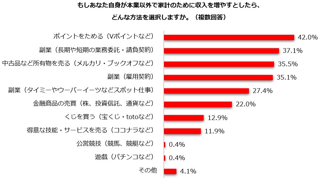 一方で、家計のゆとり予測について直近3か年を比較すると「家計にゆとりができそう」と回答した人の比率が上昇傾向にあります。厳しい中にも少しずつ、明るい兆しも感じられるようになってきているのかもしれません。「もしあなた自身が本業以外で家計のために収入を増やすとしたら、どんな方法を選択しますか」との質問には「ポイントをためる」が最も多く42.0%、次いで「副業(長期や短期の業務委託・請負契約)」が37.1%でした。4番目に「副業(雇用契約)」が35.1%、5番目に入った「副業(タイミーやウーバーイーツなどスポット仕事)」も27.4%あり、副業に関する選択肢のどれか一つ以上を選んだ人の比率は7割近くに及びます。副業への注目は、2025年もさらに高まっていきそうです。
