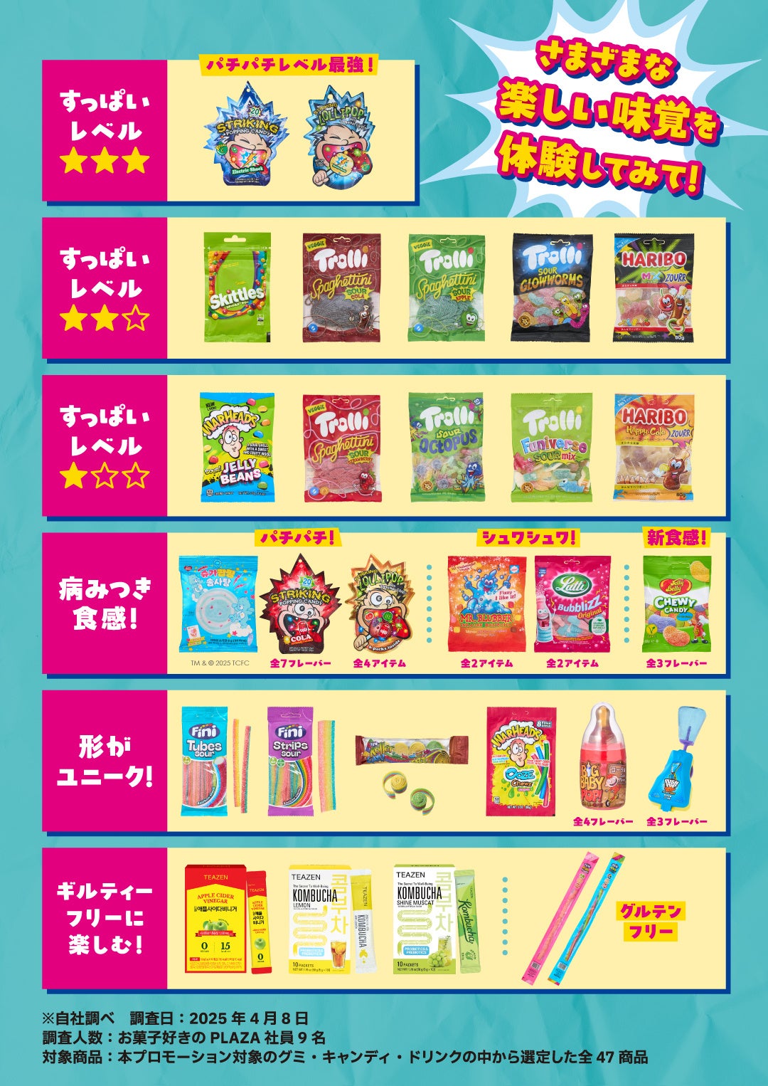 この夏、PLAZAが提案するのは「楽しい味覚体験」!暑い夏にぴったりなすっぱいフレーバーのグミやキャンディをはじめ、口の中でパチパチはじけたり・シュワシュワ泡立ったりなど、ユニークな食感のお菓子が全国のPLAZA・MINiPLAに勢ぞろいします。