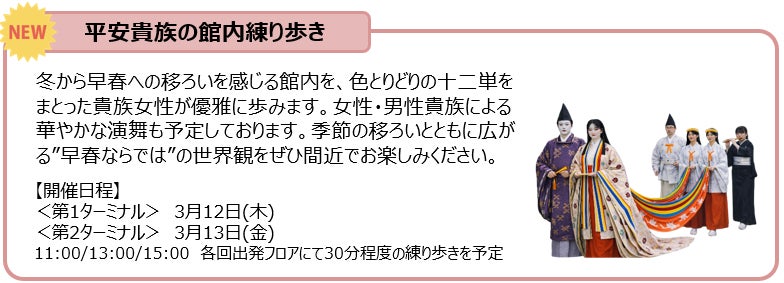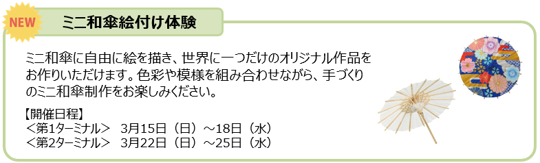 3月は「ひなまつり」をテーマに、色とりどりの十二単をまとった貴族女性による練り歩きイベントを開催いたします。また、伝統の和傘を手のひらサイズにした“ミニ和傘”に、自由に絵付けをしていただけるイベントも実施いたします。この機会にぜひお立ち寄りください。