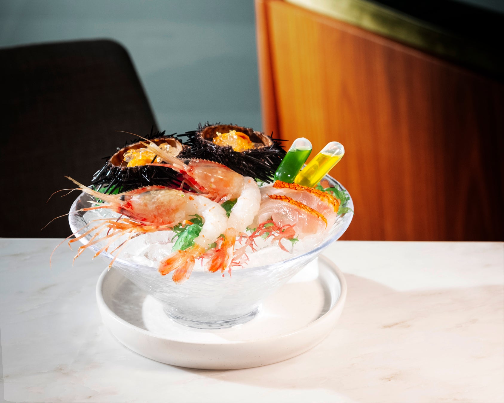 豊洲市場から仕入れた新鮮な海鮮に氷を敷いたシーフードプラッターで提供。オリーブオイルとバジルのモダンイタリアンな味付けで日本酒やスカルペッタオリジナルカクテルでお楽しみいただけます。