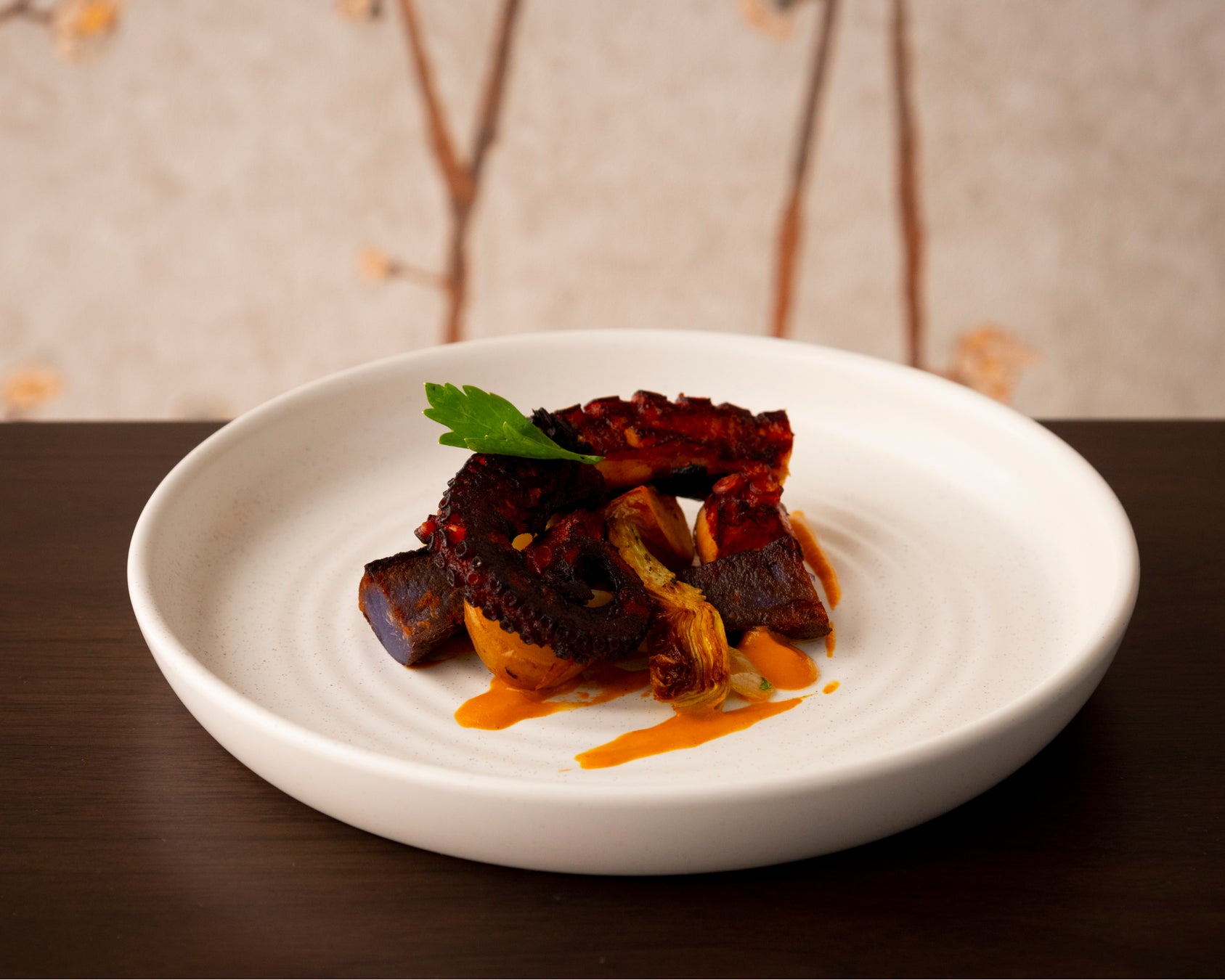 柔らかく煮たタコを仕上げにパリッと焼き上げ、ジャガイモとセロリを添えて酸味を効かせたソースで合わせた、ニューヨーク人気No,1 メニュー。
