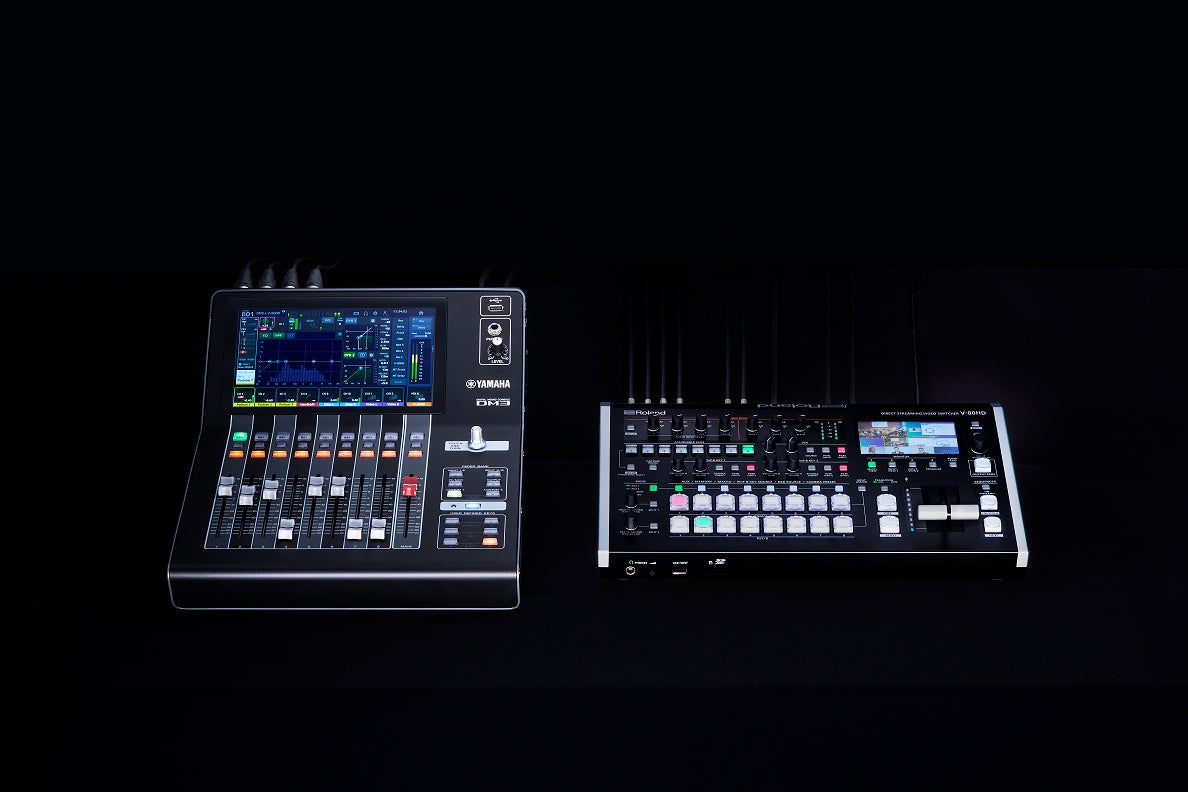 ライブストリーミングやイベントの映像制作において、高品質な音と映像はともに重要です。「DM3シリーズ」は、最大96kHzのサンプリングレートに対応し、高品位な18種類のエフェクトを2系統搭載、豊富なプリセットによる短時間でのセットアップのサポート、9インチのタッチスクリーンによるシンプルで直感的な操作性など卓越した性能を、軽量・コンパクトな筐体に凝縮しています。また、ローランド社の「V-80HD」は、プロフェッショナルのイベント現場に持ち運んで、手軽に高品位な映像演出と音声調整ができる小型のビデオ・スイッチャーで、幅広い機器の接続と映像形式に対応し、本格的な映像制作ができる充実の機能を搭載しています。