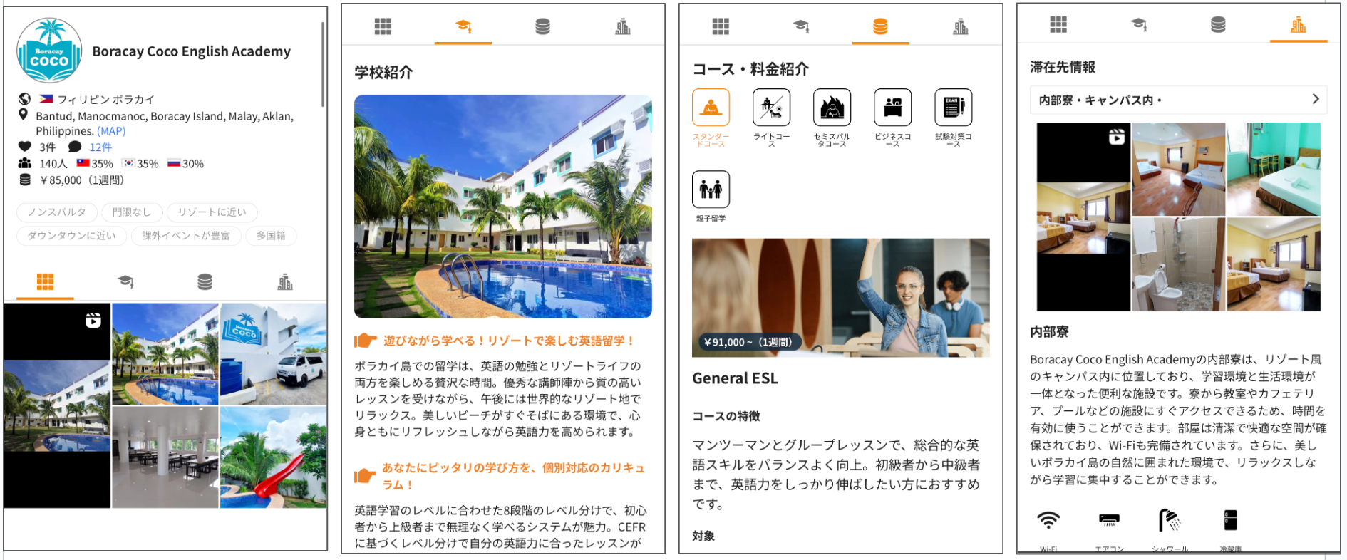 ネイティブキャンプ留学では、ユーザーが必要な情報を分かりやすく把握できるよう、常に丁寧で明確な情報提供を心がけています。Boracay COCO English Academyの詳細情報は、以下の4つのカテゴリーに分けて掲載しており、知りたい情報を的確にお届けします。