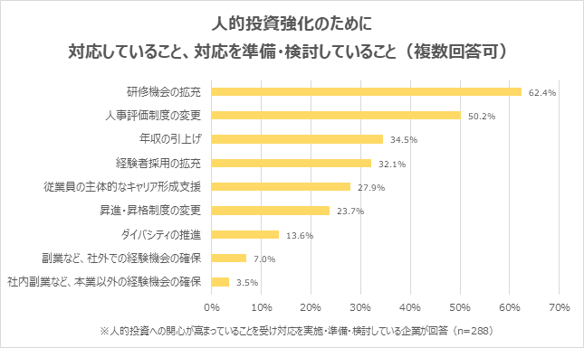 (3)人的投資強化のために、対応していること・対応を準備していることは「研修機会の拡充」が最多