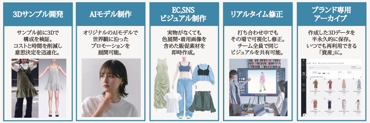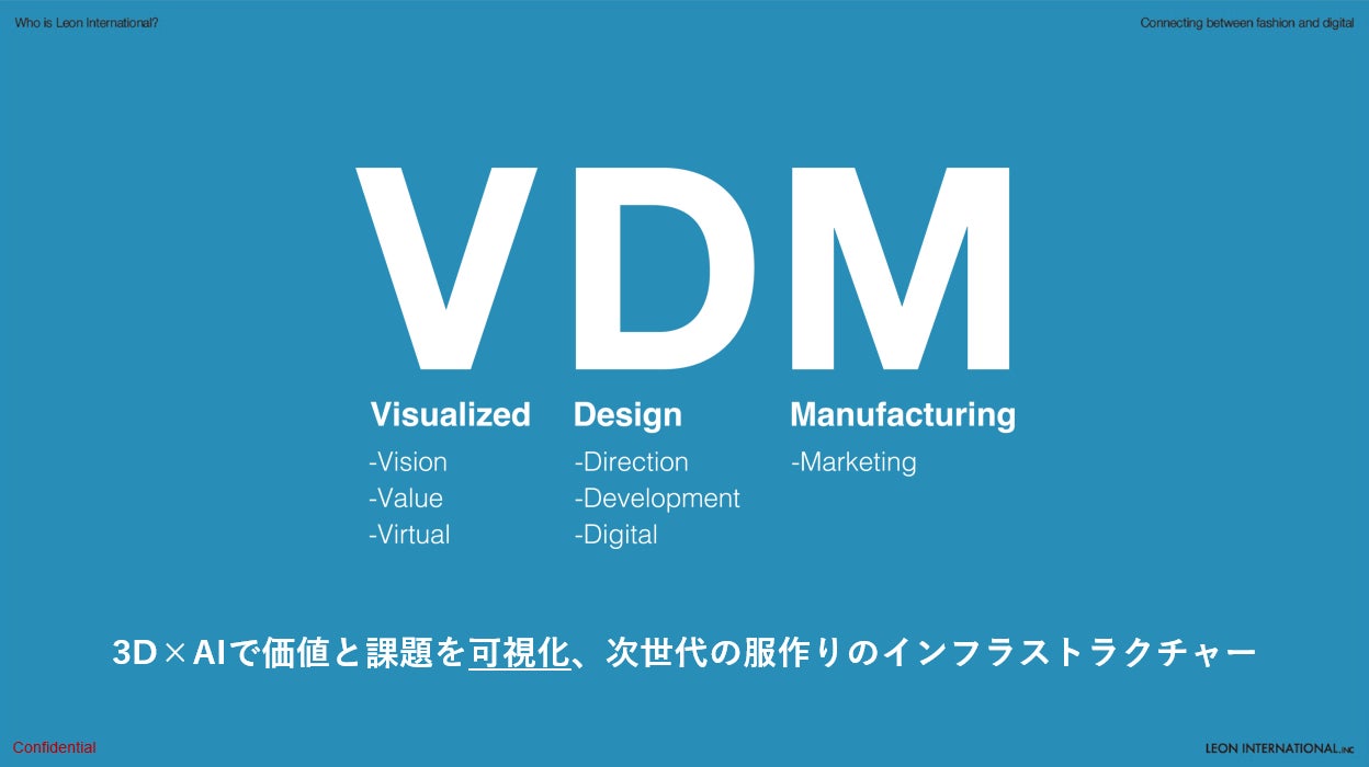 株式会社レオン・インターナショナルは、OEM・ODM事業を通じて、これまで多くのブランドとともにアパレル商品の企画・生産に取り組んできた企業です。時代のニーズを捉えた柔軟な対応力と、企画から生産・販促支援まで一貫したサービス体制を強みとし、ブランド価値の最大化を目指したサポートを提供しています。近年は、アパレル業界が直面する課題に対応すべく、3D・AIといった先端技術を積極的に取り入れた新しい開発フロー「VDM(Visualized Design Manufacturing)」を構築。再現性・スピード・省力化を両立する仕組みとして、各ブランドのDX推進を支援しています。ファッションの表現力と、生産現場の効率性。その両立を目指し、より実践的で持続可能な開発の在り方をこれからも追求してまいります。