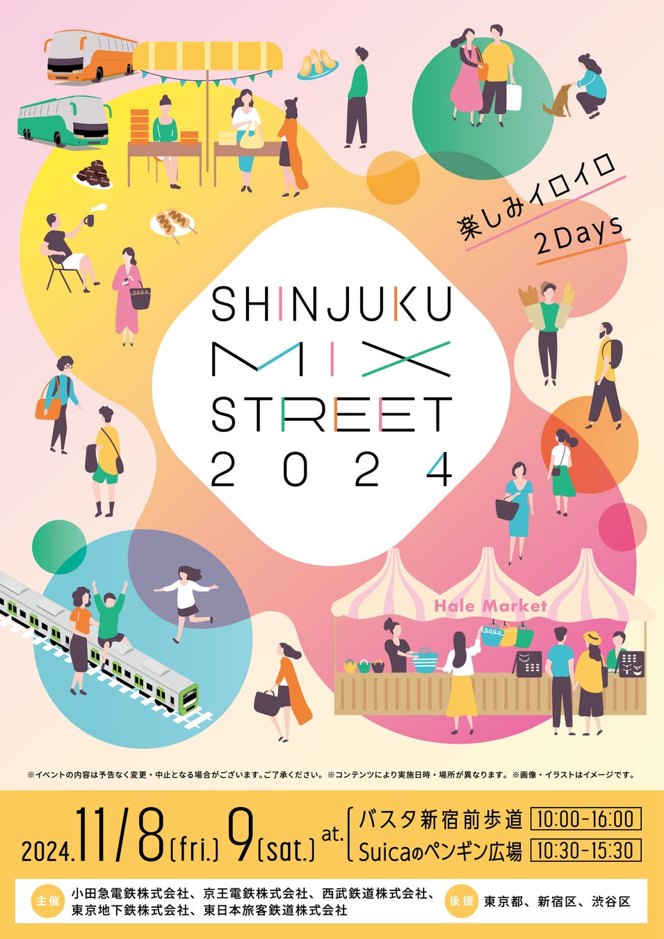 小田急電鉄株式会社、京王電鉄株式会社、西武鉄道株式会社、東京地下鉄株式会社、東日本旅客鉄道株式会社が共同して、2024年11月8日(金)、9日(土)に、甲州街道(バスタ新宿前)歩道・Suicaのペンギン広場にて、公共空間等を活用した賑わいの創出を目指す「SHINJUKU MIX STREET 2024」を開催します。