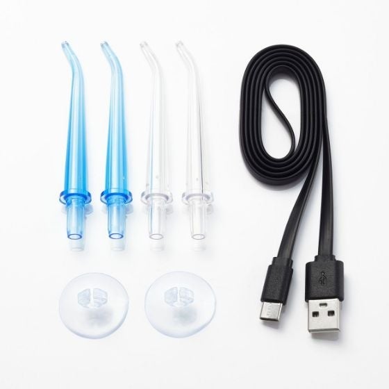 ■フロスノズルはクリアとブルーの2色×2本を付属。ノズルを挿し替えて家族やパートナーと使い分けができます。