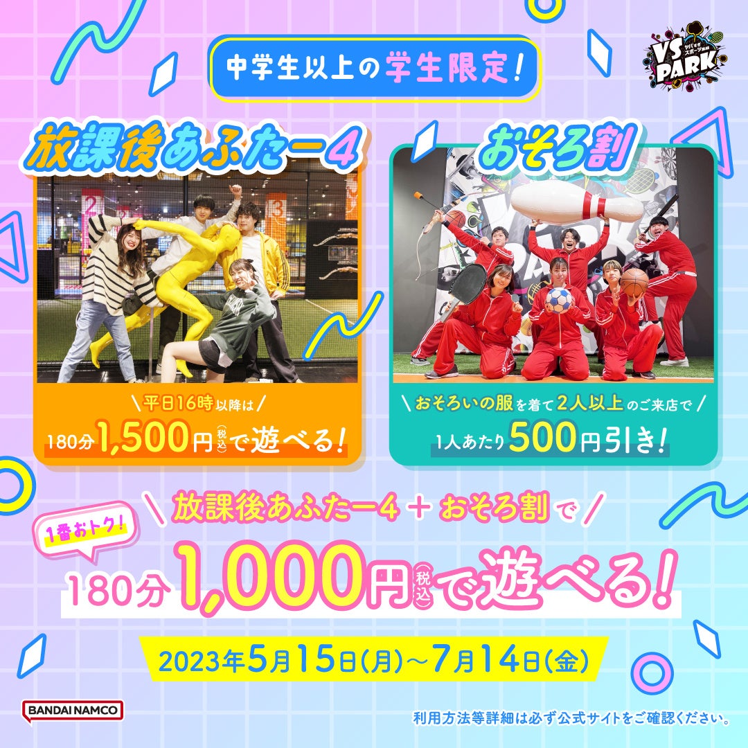 株式会社バンダイナムコアミューズメントが運営する新感覚バラエティスポーツ施設『VS PARK』では、2023年5月15日(月)から7月14日(金)までの期間、中学生以上の学生限定で、通常よりもおトクに遊べる「放課後あふたー4」と「おそろ割」を同時開催します※1。