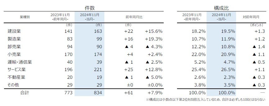 業歴10年未満の『新興企業』〈「3年未満」(前年同月34件→42件、23.5%増)、「5年未満」(同55件→64件、16.4%増)、「10年未満」(同167件→171件、2.4%増)〉は277件(前年同月256件、8.2%増)を数えた。全体の33.2%を占め、2022年10月(33.8%)に次いで過去3番目の高水準となった。内訳を業種別にみると、「サービス業」(同81件→99件、22.2%増)が最多となり、「小売業」(同62件→67件、8.1%増)が続いた。