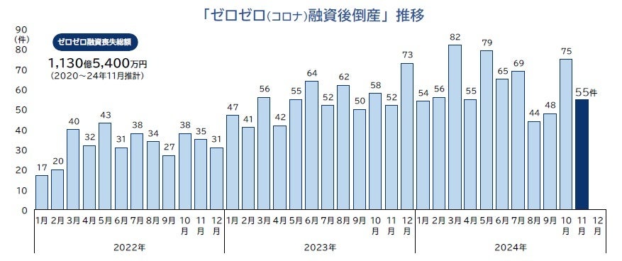 「ゼロゼロ(コロナ)融資後倒産」は55件発生し、1-11月累計は682件で過去最多