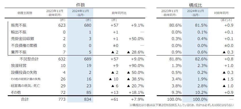 主因別にみると、「販売不振」が680件(前年同月623件、9.1%増)で最も多く、全体の81.5%(対前年同月0.9ポイント増)を占めた。「売掛金回収難」(前年同月2件→3件、50.0%増)、「業界不振」(同7件→5件、28.6%減)などを含めた『不況型倒産』の合計は689件(同632件、9.0%増)となり、31カ月連続で前年同月を上回った。