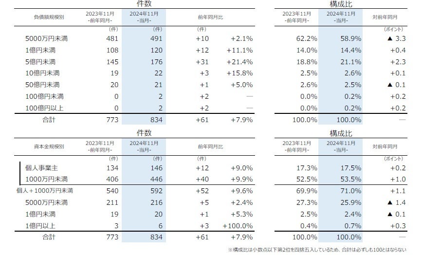 倒産件数は834件 31カ月連続で前年同月を上回る2024年累計は11月時点で2015年以降で最多に ― 全国企業倒産集計2024年11月報