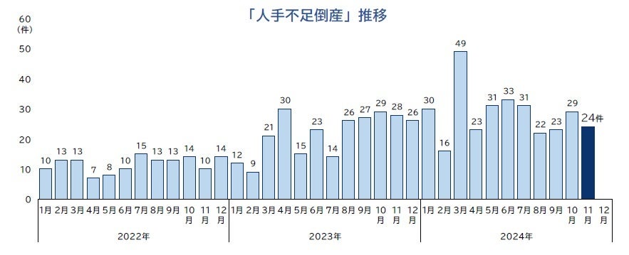 「人手不足倒産」は24件発生し、年間件数は初めて300件を超え、過去最多