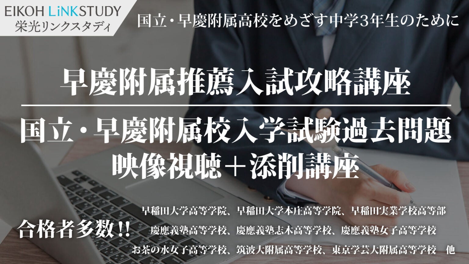 難関高校受験指導を行うオンライン進学塾「EIKOH LiNKSTUDY(栄光リンクスタディ)」では、国立・早慶附属高校を目指す中学3年生を対象に、「早慶附属推薦入試攻略講座」と「国立・早慶附属校入学試験過去問題 映像視聴+添削講座」を開講しています。