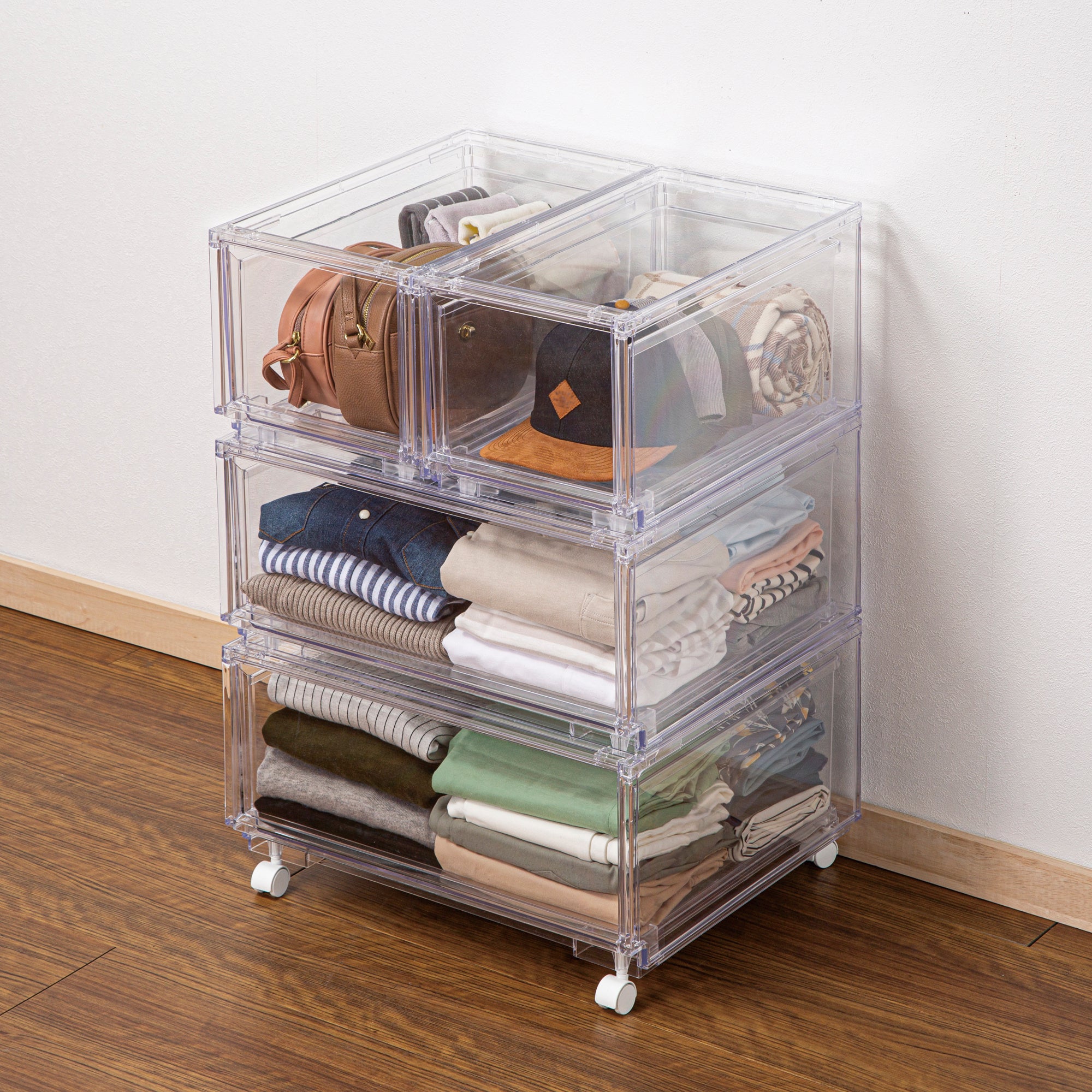 衣類や小物はもちろん、日用品の整理やお子様のおもちゃ入れにも最適です。別売りのキャスターを取り付ければ、クローゼットや押入れへの移動もスムーズに行えます。