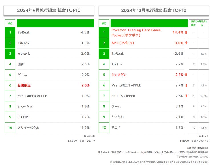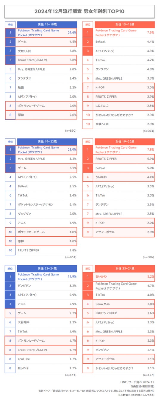 最新Z世代トレンドは「Pokémon Trading Card Game Pocket」「APT.」が初登場でTOP2!LINEリサーチ、全国の15〜24歳の男女を対象に、流行に関する調査を実施