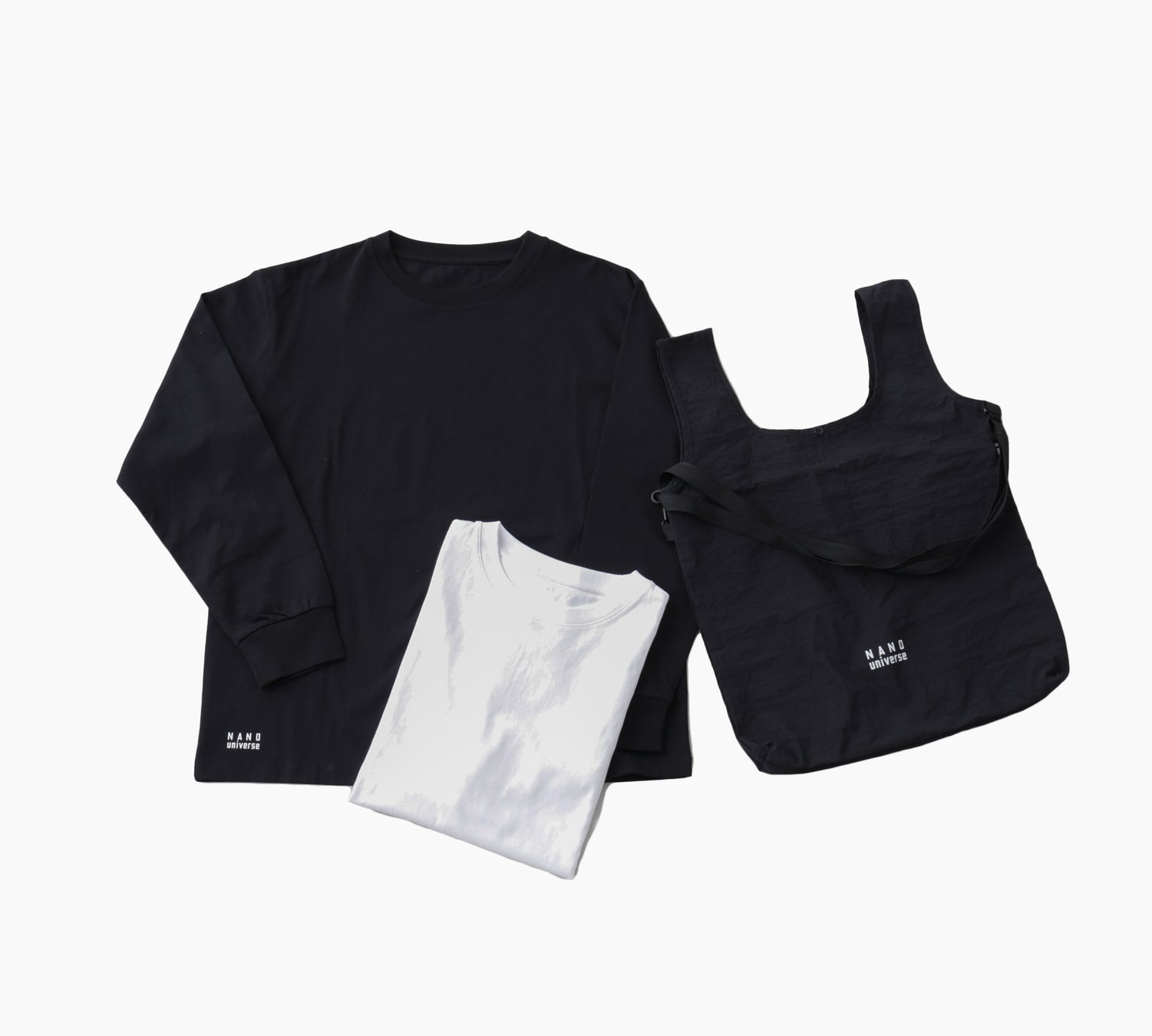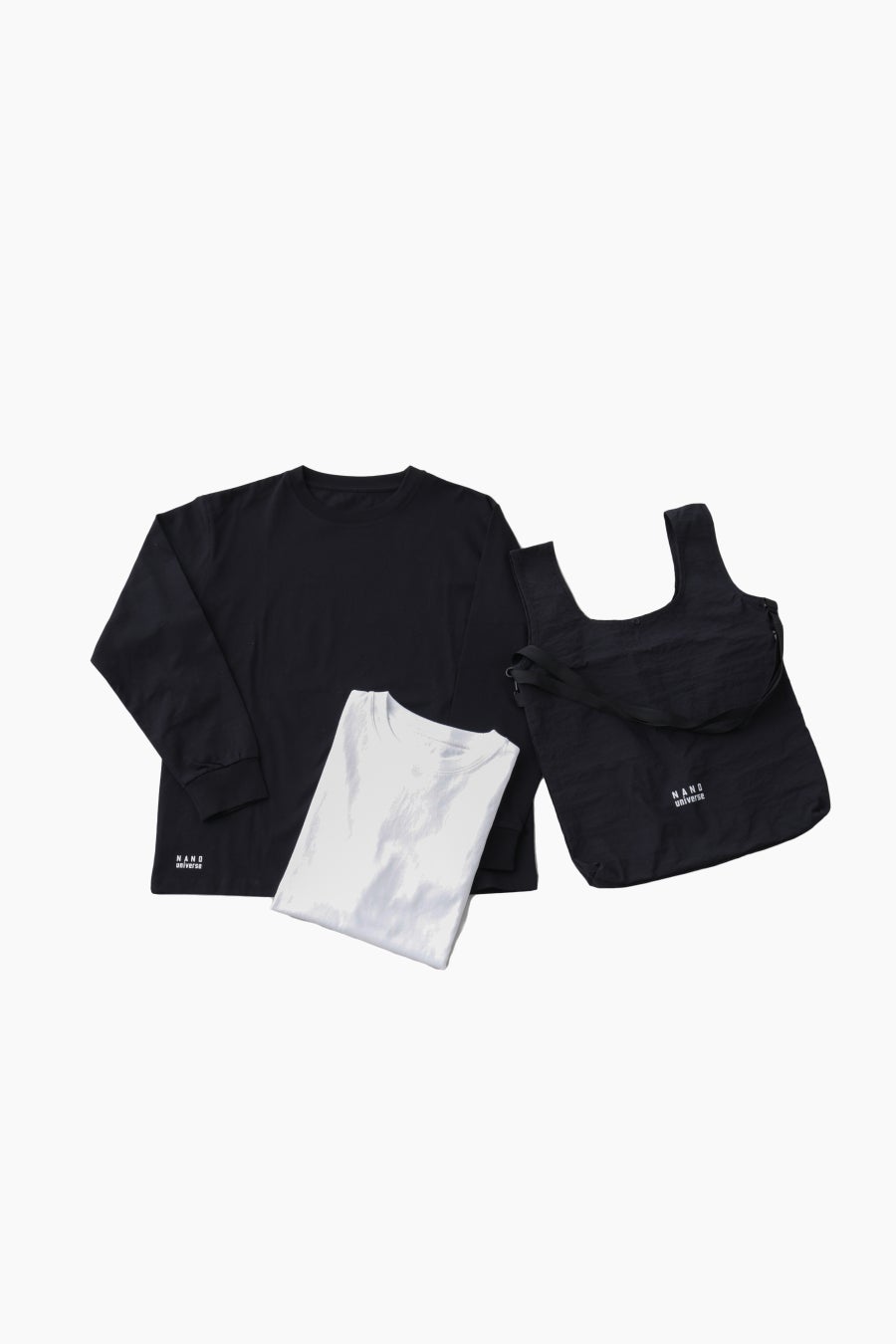 ユニセックスで着用できるロングスリーブTシャツ2枚(ホワイト・ブラック)にマルシェ型トートバッグが付いた、株主様限定での「ナノ・ユニバース」オリジナルセットです。