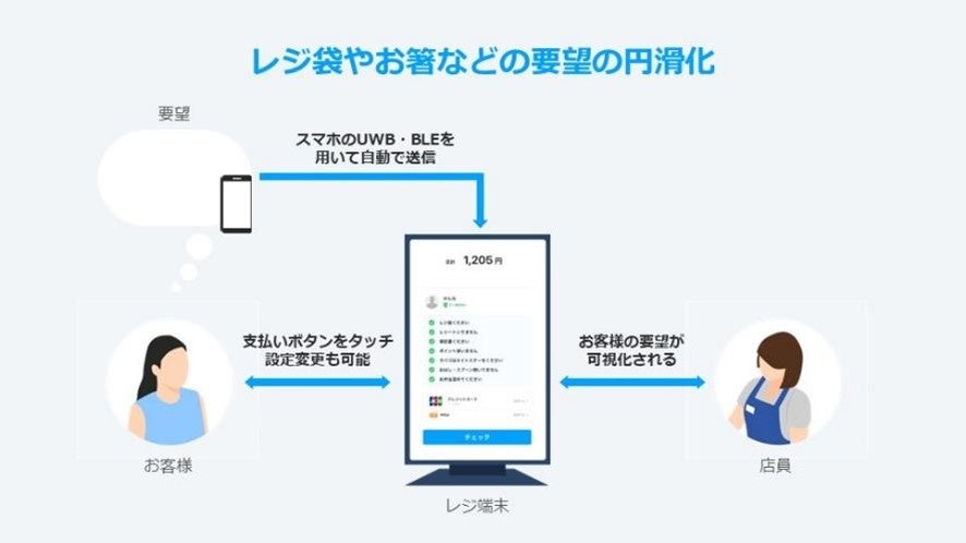 店頭ではスマートフォンのアプリと店舗レジ機材がUWB/BLEを用いて通信し、お客様のスマートフォンを取り出したり操作したりすることなく、自動的にアプリ上で設定された情報を店頭レジ機材へ送信いたします。店舗レジ機材の店員側の画面にはお客様があらかじめ設定したチェック項目が表示されるため、お客様と店員が口頭確認せずにスムーズに買い物ができるようになります。店舗レジ機材のお客様向け画面はタッチパネルになっており、事前に設定したチェック項目をその場で変更することもできます。