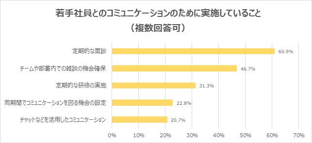 (4)若手社員とのコミュニケーションのために実施していることは「定期的な面談」が最多