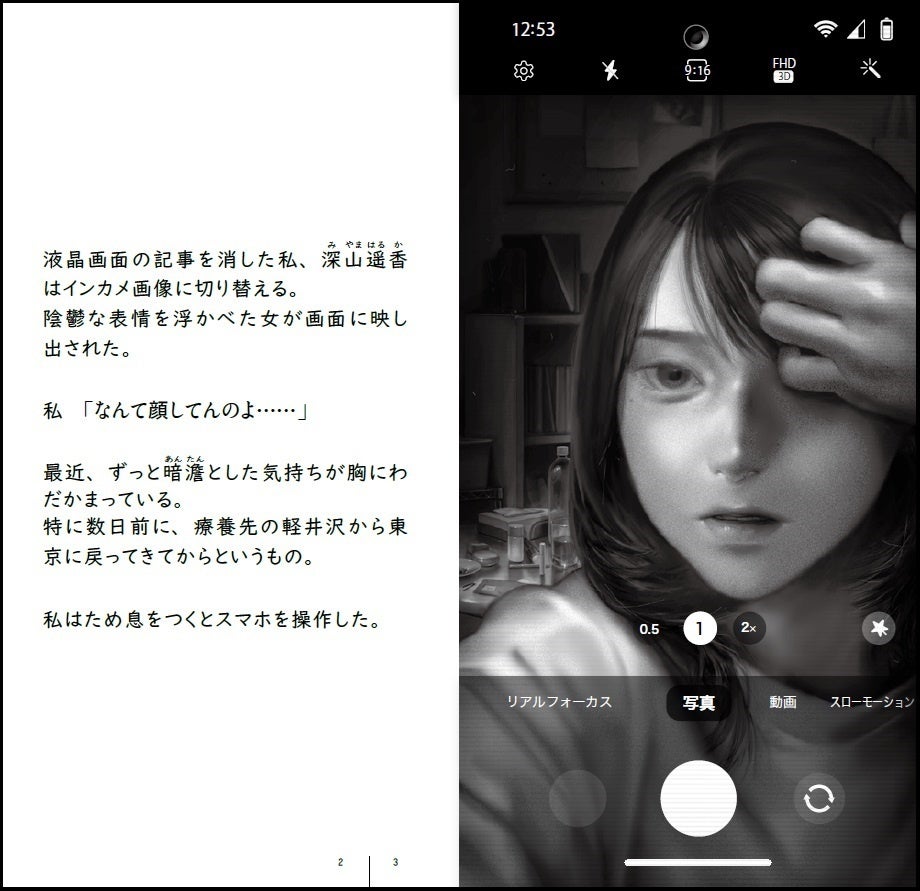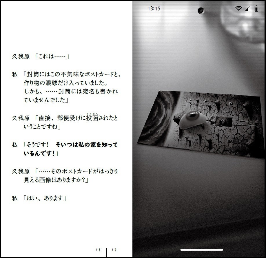 スマホサイズの特殊判型で、左ページに主人公語りの本文、右ページはスマホ画面のビジュアルで物語が進行。