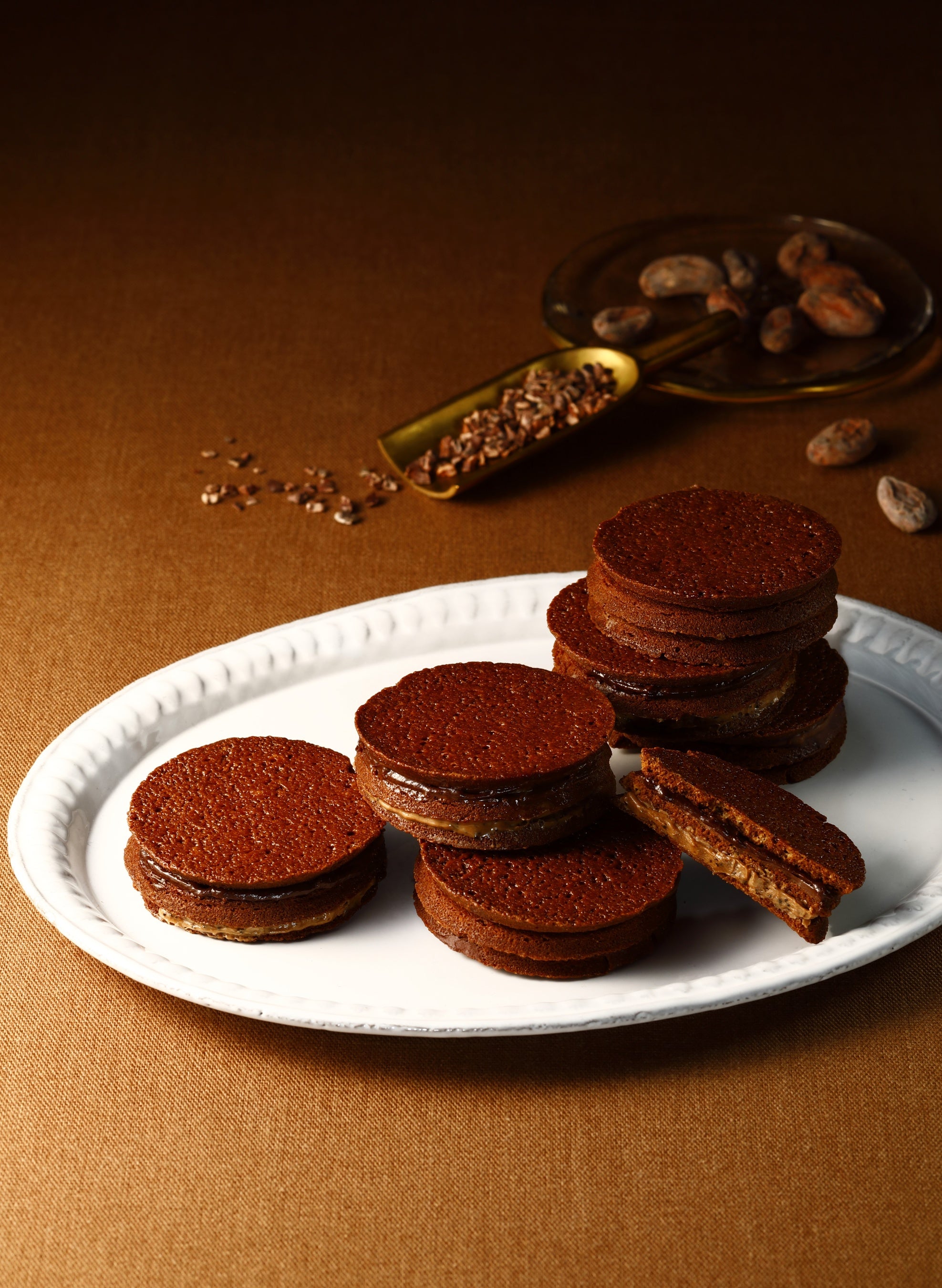 カカオマスをあわせたキャラメル仕立てのクッキーで2種類のチョコレートをサンドしました。