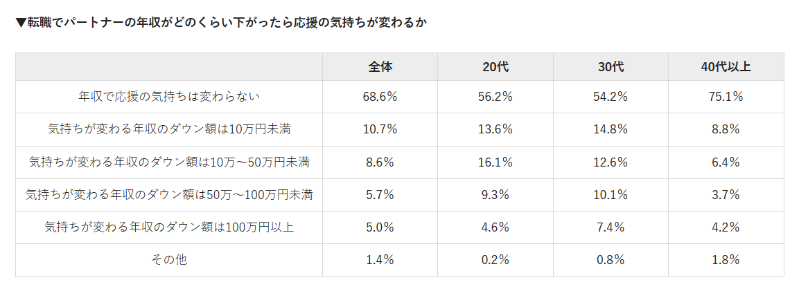 パートナーが転職する場合に応援すると回答した人に対して、転職で年収が下がったら応援する気持ちが変わるか聞いたところ、「年収で応援の気持ちは変わらない」と答えた人が68.6%を占めました。年代別では、20代が56.2%、30代が54.2%、40代以上が75.1%で、特に40代以上が高くなっています。40代以上に比べて20代や30代は、パートナーの転職による年収の低下が応援の気持ちに影響しやすいことが伺えました。