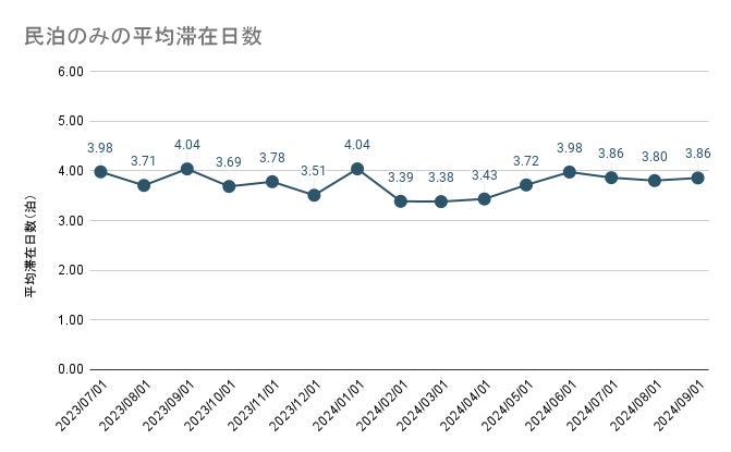 今回のレポートでは、宿泊したゲストの国別割合は日本が前回のレポートより8.7%増加、中国が2.9%増加、台湾がアメリカと韓国を抜きました。特に国内旅行客の民泊利用が増えていることを示しています。また、平均の宿泊滞在日数は、7月から9月の平均で3.84泊と週の半分は拠点として滞在しています。