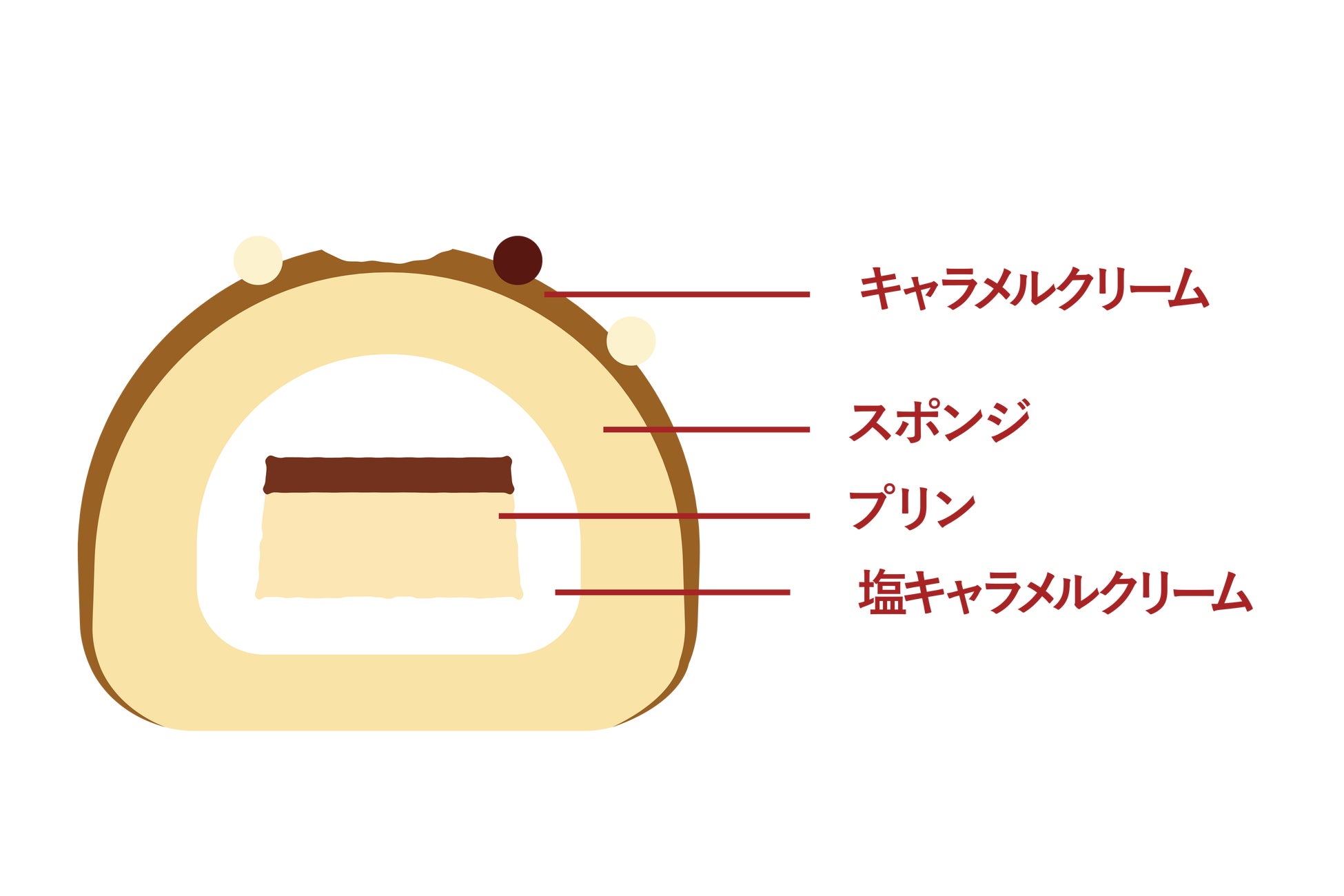 キ』。中にもプリンをサンドし、コクのあるキャラメルクリームとホイップクリームを合わ