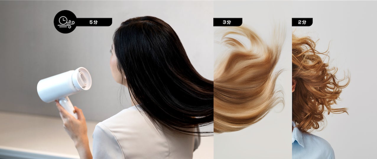 *2分、3分、5分の髪のドライ速度は、ショートヘア、肩までの長さ、ロングヘアの女性を対象に、最高温度と最高パワーを使用したテストに基づきます。