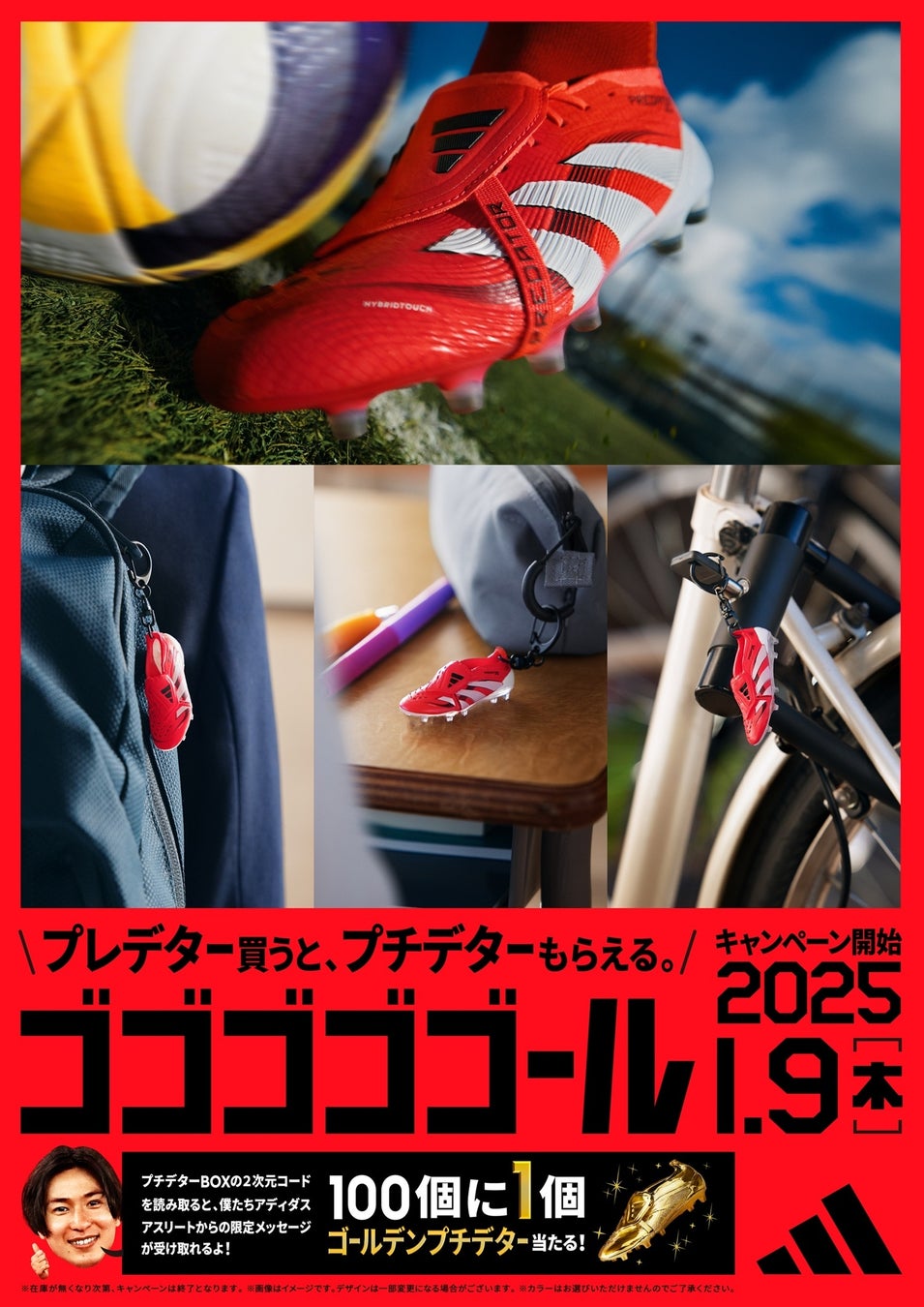 アディダスアプリでは、adiClub会員限定で対象のプレデターをご購入した方に「ゴールデンプチデター」(ミニプレデターキーホルダー)が抽選で当たるキャンペーンを実施します。アプリで対象商品を購入後、キャンペーンサイトよりご応募ください。