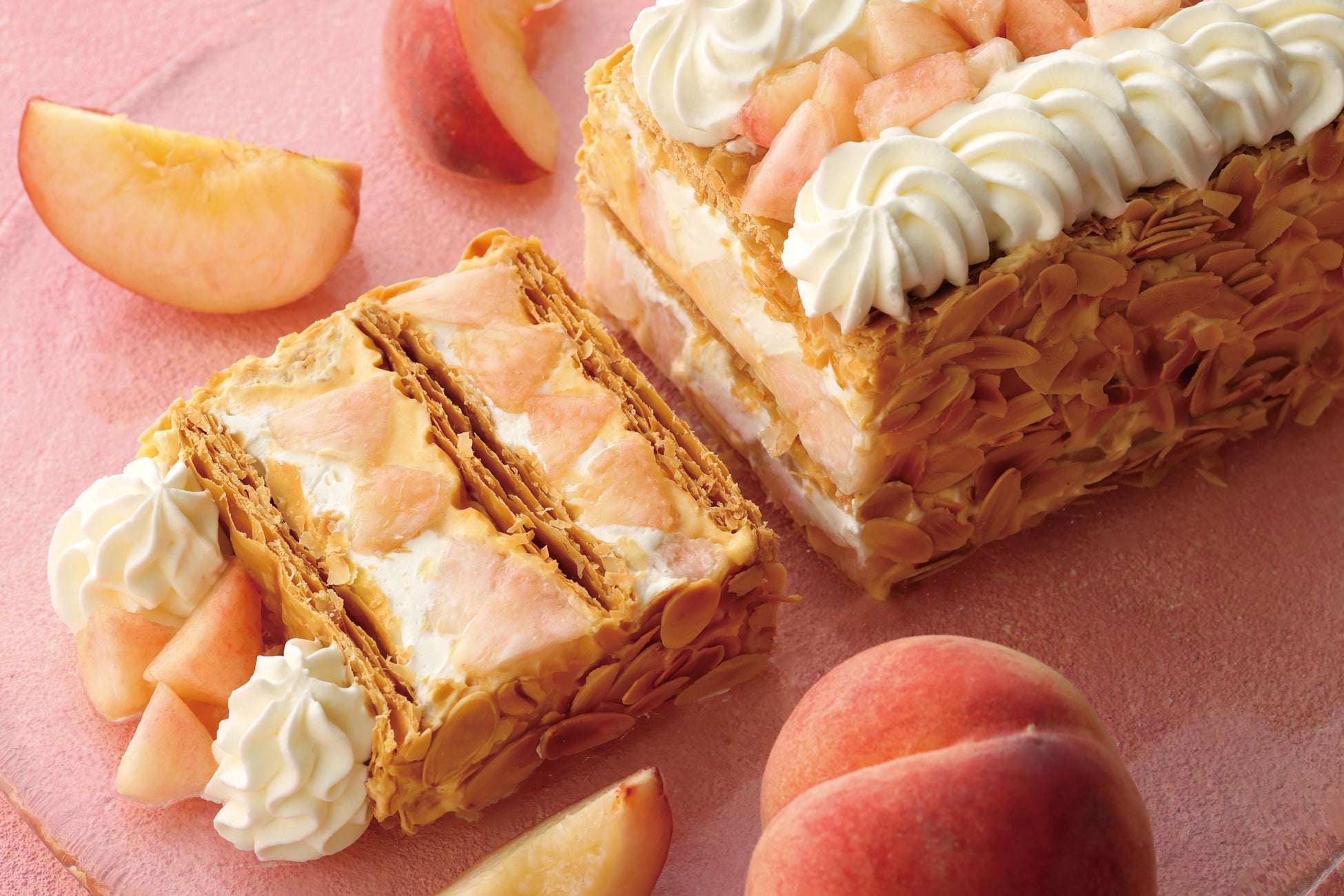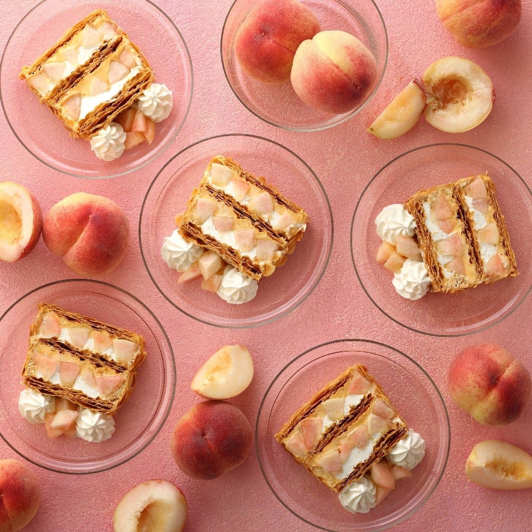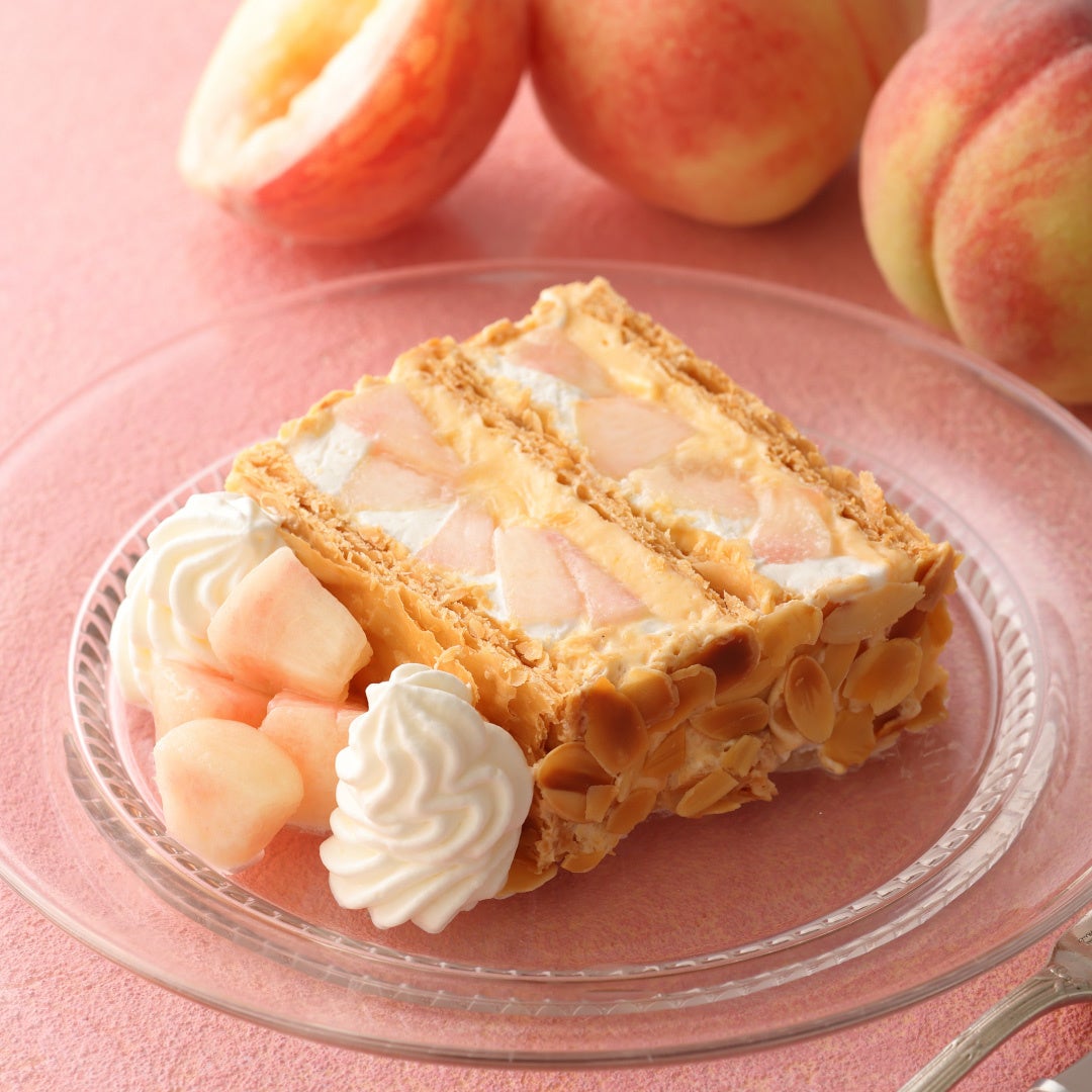 KIHACHIの定番ナポレオンパイを白桃でアレンジ。フレッシュの白桃、サクサクのパイ生地、クレーム・シャンティとディプロマットクリームを丁寧に重ねました。